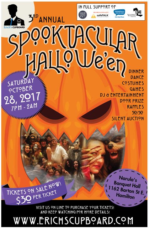 Announcing the 3rd Annual Hallowe’en Spooktacular fundraiser on Saturday October 28, 2017 from 7pm 2am, at Narula’s Banquet Hall – 1162 Barton Street E. Hamilton. See website on donation page for ticket sale information http://www.erichscupboard.com. Get your costumes ready and break out your dancing shoes! This event is not only a frightfully good time, but also an incredible way to connect with your fellow community members and raise money for several worthy causes. Tickets are $30 and will feature dinner with a delicious sweet table later in the evening, dancing, silent auction, raffle prizes, games, 50/50 draw, DJ and live entertainment. Benefiting a number of organizations, proceeds will be used to host safeTALKs (Suicide Awareness Training Sessions), as well as raising awareness of various mental health resources in the Hamilton community including Kids Help Phone, Hamilton Community Land Trust, and helping fill the food cupboards at The Eva Rothwell Resource Centre. http://www.erichscupboard.com