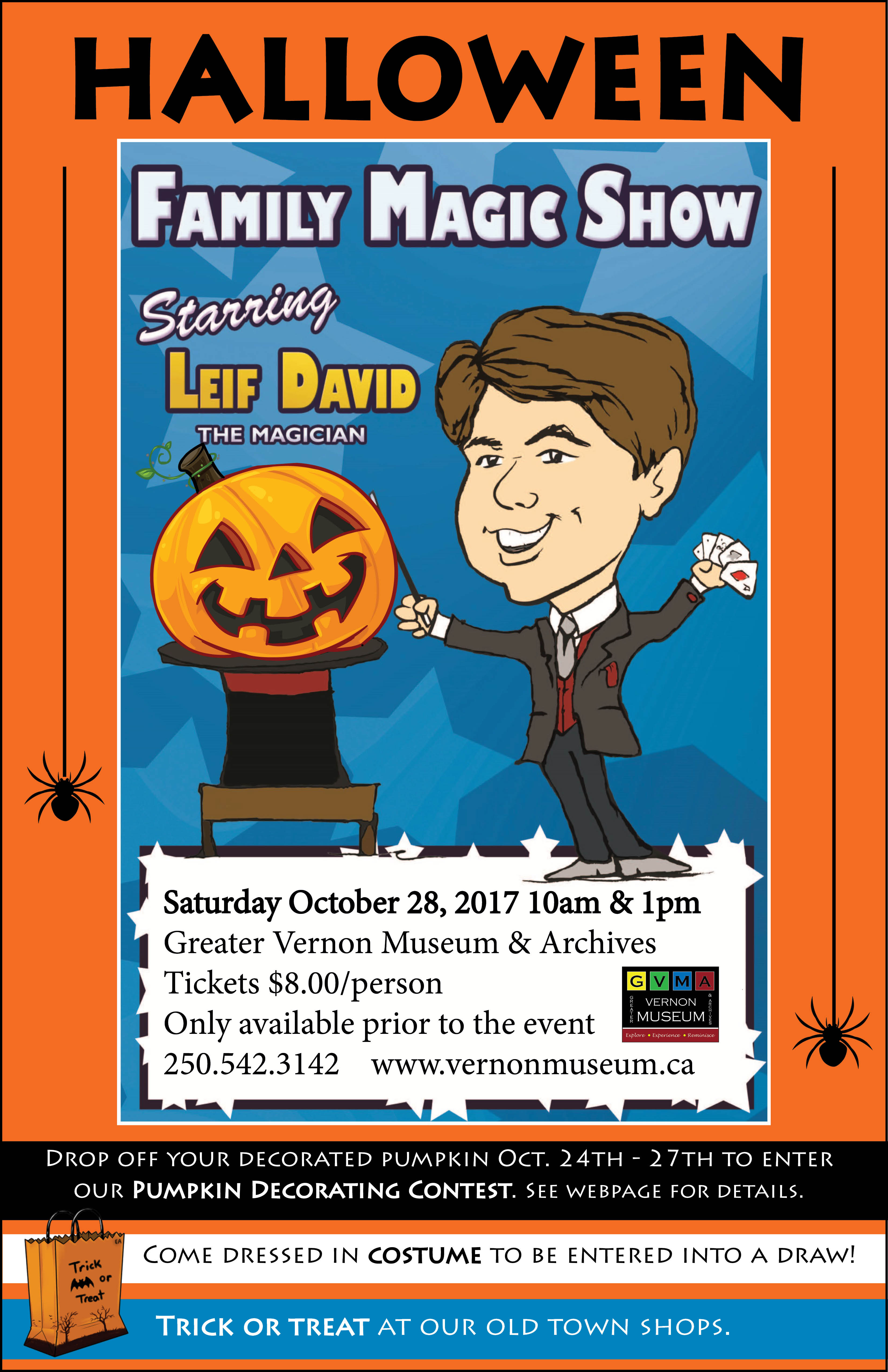 The Greater Vernon Museum & Archives Halloween Magic Show featuring magician Leif David will be held Saturday October 28th with two show times, 10am and 1pm. Following the show children will have the opportunity to trick or treat the old town shops. Come dressed in costume to have your name entered into our prize draw. Those wishing to take part in our Family Pumpkin Carving Contest can drop off their creations Oct. 24th -27th to have their pumpkin displayed during the event. The winning entry will receive a family pass from the H2O Centre as well as dinner at the Spaghetti Factory” said Manifold. All entries will be on display during the magic show. Tickets for the magic show are just $8.00/person available at the Vernon Museum prior to the show. As space is limited it is strongly suggested to purchase your tickets early. For more info please call 250-542-3142, visit http://www.vernonmuseum.ca or find us on facebook.