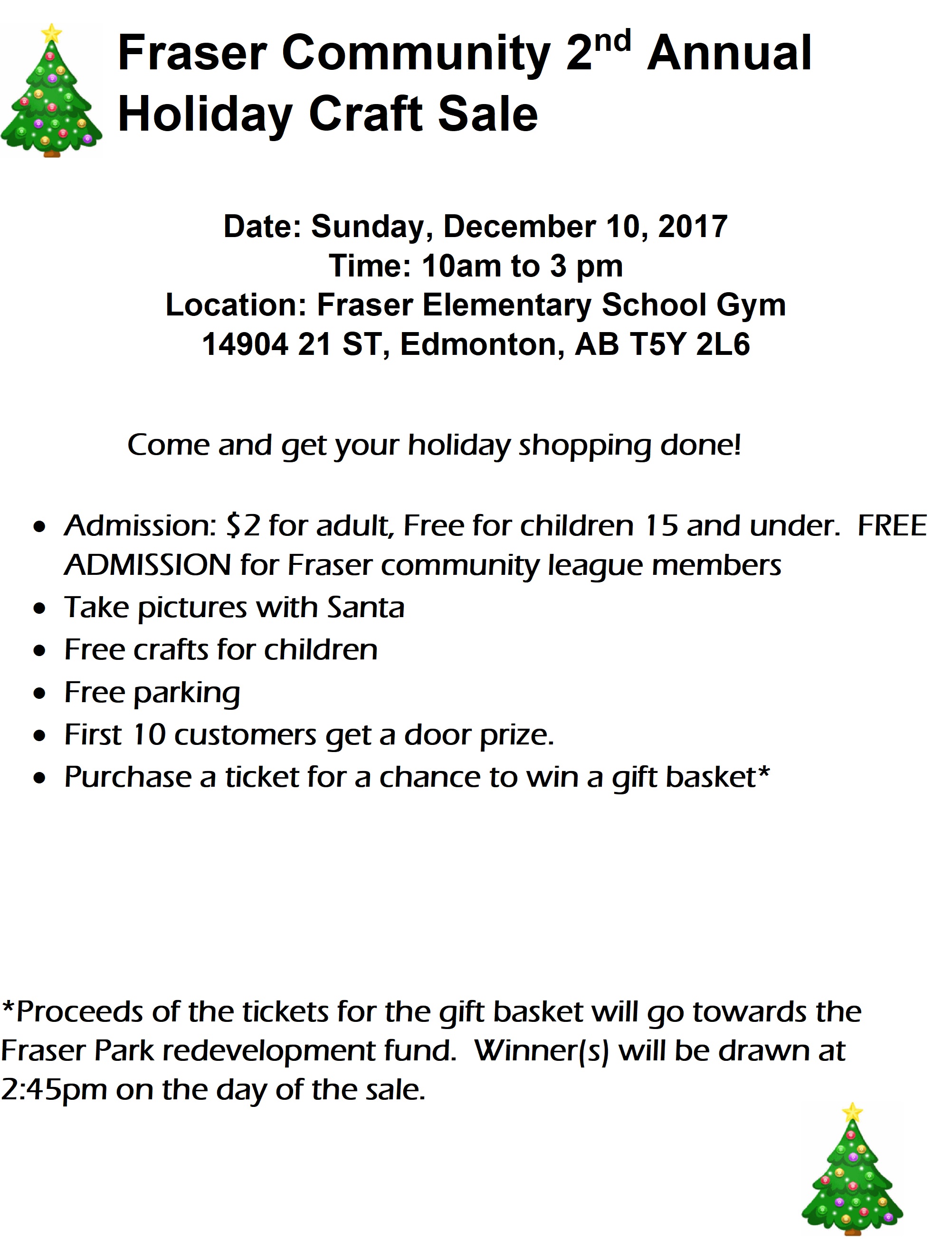 Date: Sunday, December 10, 2017 Time: 10am to 3 pm Location: Fraser Elementary School Gym 14904 21 ST, Edmonton, AB T5Y 2L6 Come and get your holiday shopping done! • Admission: $2 for adult, Free for children 15 and under. FREE ADMISSION for Fraser community league members • Take pictures with Santa • Free crafts for children • Free parking • First 10 customers get a door prize. • Purchase a ticket for a chance to win a gift basket* *Proceeds of the tickets for the gift basket will go towards the Fraser Park redevelopment fund. Winner(s) will be drawn at 2:45pm on the day of the sale.