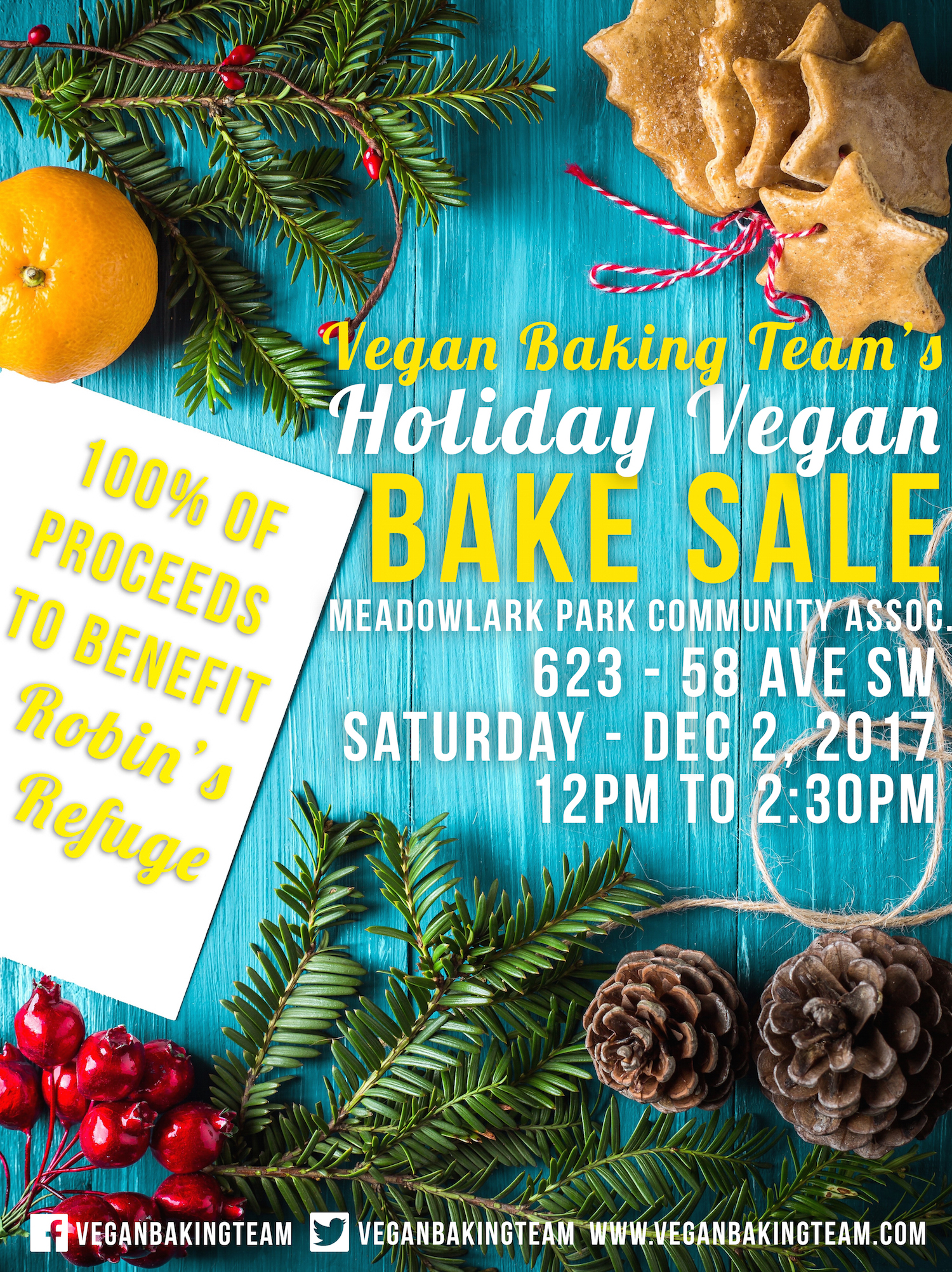 The Vegan Baking Team presents its 2017 YYC holiday bake sale! If you’re on the hunt for some festive treats for the upcoming holiday season, stop by the Meadowlark Park Community Association on Saturday, December 2nd from 12pm-2:30pm to stock up on some sweet and savory baking while supporting a fantastic cause! All proceeds from the sale will be donated to Robin’s Refuge Farm Sanctuary. Where: Meadowlark Park Community Association, 623 – 58th Ave SW When: Saturday, December 2nd, 2017 Time: 12pm to 2:30pm (or sell out) Facebook Event: https://www.facebook.com/events/1519599754800619/ The holiday sale will feature a wide variety of seasonal vegan treats, as well as an array of bake sale classics, such as brownies, cookies, cupcakes, cinnamon buns, pizza buns and more! Among the sweet and savory homemade offerings will also be a selection of gluten-free items. We encourage everyone who plans on stopping by to bring reusable bags or containers to help cut down on any waste that may be created by the sale. Come join us for ridiculous amounts of baked deliciousness, hot chocolate and your favourite cheesy holiday tunes, you won’t want to miss out! Calling All Bakers! To make this the best holiday bake sale yet, we need your help. Show off those sweet baking skills by signing up to donate some treats, or help spread the word by putting up flyers around the city. Contact veganbakingteam@gmail.com, http://www.facebook.com/veganbakingteam or https://twitter.com/veganbakingteam to volunteer! About Robin’s Refuge Robin’s Refuge is a non-profit organization dedicated to providing lifelong sanctuary to exploited and abused farm animals. They are committed to advocating for these animals through public education, striving to teach humane treatment of animals, alternative lifestyle options that include more environmentally friendly choices and to remove the ignorance that surrounds animal based industries. To learn more please visit http://www.robinsrefuge.org or http://www.facebook.com/robinsrefuge.