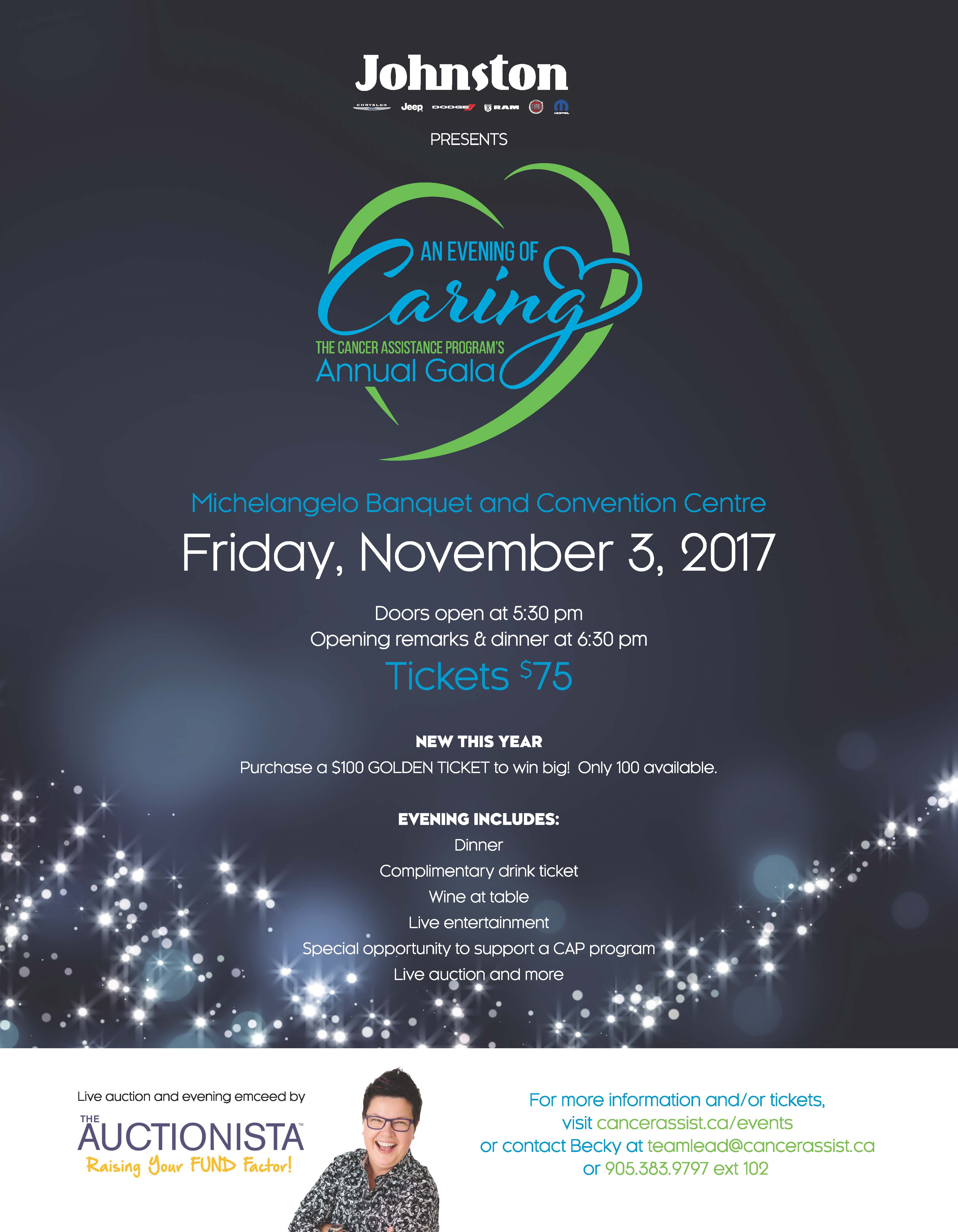HAMILTON, ONTARIO — October 19, 2017 – “An Evening of Caring” is the theme for the Cancer Assistance Program’s (CAP) 16th Annual Gala. The signature event aims to raise the much-needed funds to continue to provide free services to those affected by cancer in the Hamilton and surrounding communities. According to the Cancer Quality Council of Ontario, over 10, 000 people within the Greater Hamilton Area are projected to be diagnosed with cancer in 2017, and more than 88, 000 in all of Ontario. These numbers suggest there will be an increase in the need for services provided by CAP in 2017. CAP’s new Executive Director, Debbie Logel Butler notes, ‘We have already seen evidence of an increased need for our services. In 2016, CAP offered services to over 3,200 people living with cancer, and more than 1,400 were new clients. That’s a 19% increase in new clients and an overall increase of 21% in total clients served in 2015.” To keep up with the growing need, CAP’s annual gala on Friday, November 3, 2017 at Michelangelo Banquet Centre will feature dinner, dancing, and a live auction, with many fun and exciting ways to win and donate.
