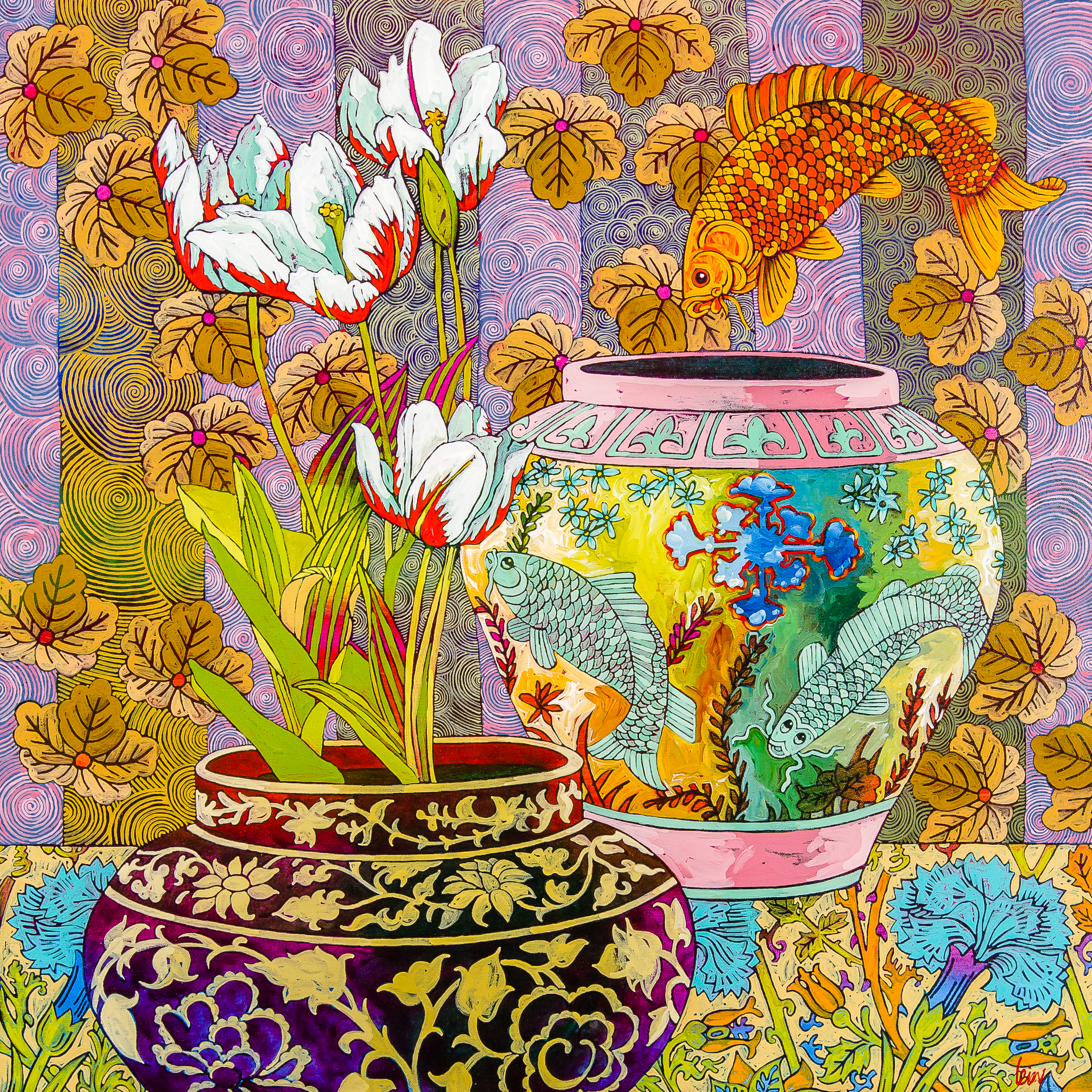 The West End Gallery is delighted to present an exhibition of new work from beloved West Coast artists Grant Leier and Nixie Barton, opening Saturday, October 28 between 1 – 4 pm. Grant Leier’s unique and exotic still life paintings are rich in colour and pattern, while Nixie Barton’s whimsical decoupage fruits and flowers fall in and out of the picture plane, which she describes as “a wonky sense of composition” with colours and strong patterns. All artwork subject to pre-sale. Exhibition continues through November 9. “I’ve never been interested in painting the landscape. I feel a need to inject intense colour, pattern, and a sense of celebration into everything I paint. I want the ordinary to be exotic, the black dog to be red, the pears to be blue. My focus has been colour, people, animals and… still life. More than anything I want my images to evoke a sense of well-being and goodness… I believe that documenting social and political concerns in the visual arts is important, but I feel it is equally important to pursue the creation of work that simply makes you feel good.” – Grant Leier