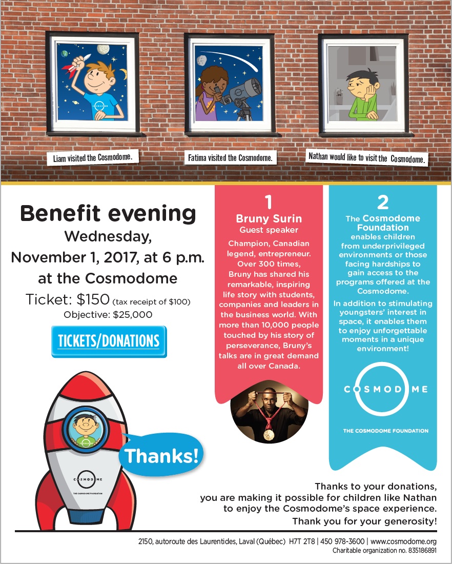 Join us in welcoming Bruny Surin, Olympic Athlete, as we enjoy an exciting evening of science exploration, silent auction and a 4D experience all for the benefit of supporting children so that they too can learn more about STEAM and space exploration. The Cosmodome Foundation is a fledgling fundraising group, in our 4th year. We run one event a year to raise monies to sponsor children to visit the science center and to be exposed to STEAM activities in the field of space sciences. n the short time we have been fundraising we have been able to support women’s shelters in the province, moms who bring their children for a day; small groups of students from schools who might not normally be able to visit the Cosmodome; children with handicaps or maladjsutements and many other individual children. To date we have sponsored 825 students and our goal this year is to raise enough funds to sponsor 500 students in the current year.