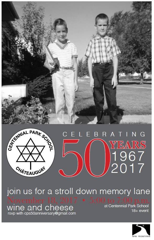 Centennial Park elementary School, of the New Frontiers School Board is celebrating 50 years of learning! Join us on November 18 from 5-7 at 85 Jeffries, Chateauguay QC, J6J 4A4 to reminisce with old friends and staff members! Find CPS & our event on our Facebook Page!