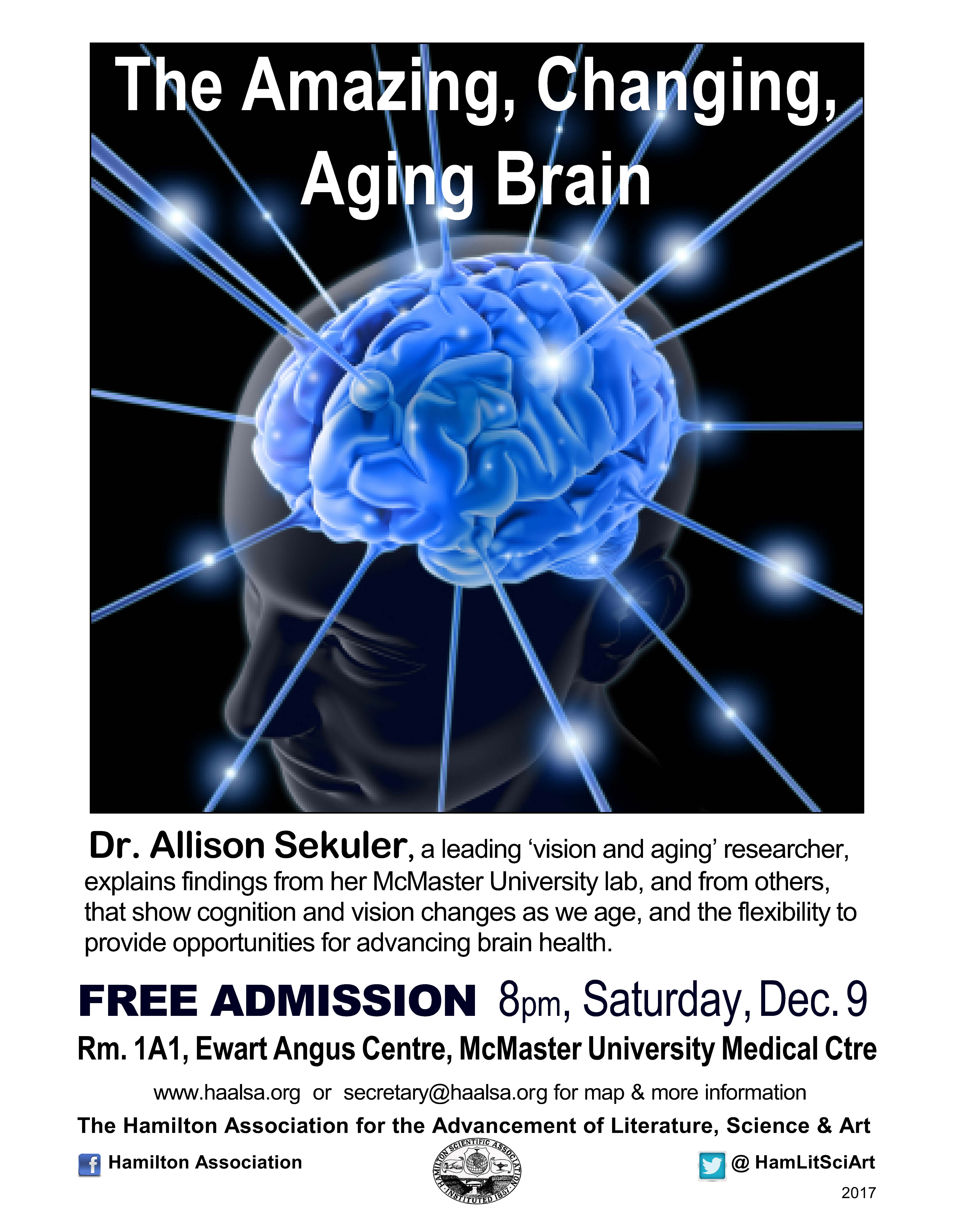Dr. Allison Sekuler, a leading researcher at McMaster University and Baycrest Health Sciences, describes how vision and cognition change as we age, and how brain flexibility presents opportunities for healthier aging. See http://www.haalsa.org for details, map and parking advice. Parking under the hospital not recommended. HSR bus stop nearby.