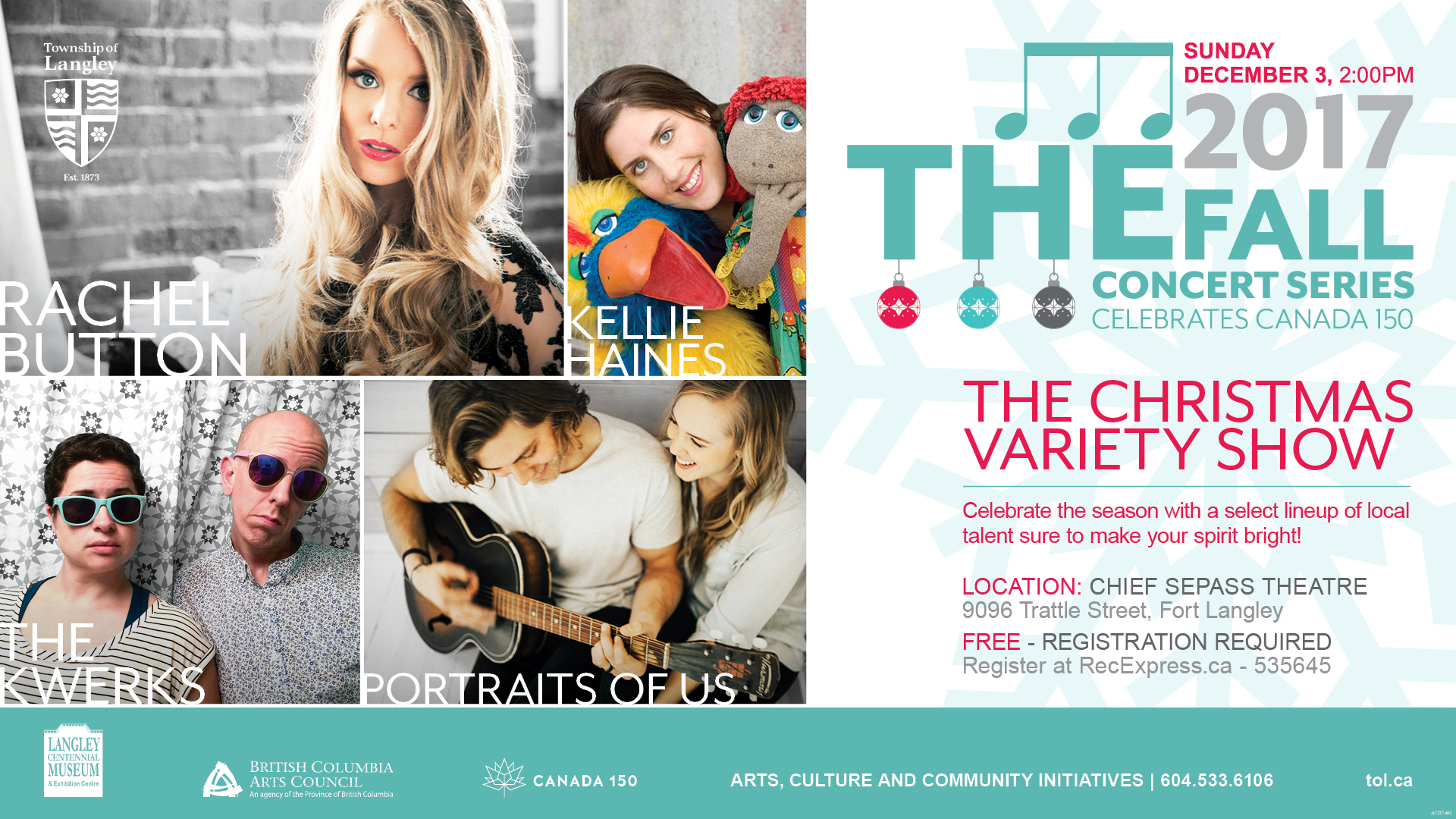 The 2017 Canada 150 Fall Concert Series continues with A Christmas Variety Show. Celebrate the season with a select lineup of local talent sure to make your season bright! December 3, 2017 at 2pm, at the Chief Sepass Theatre in Fort Langley.