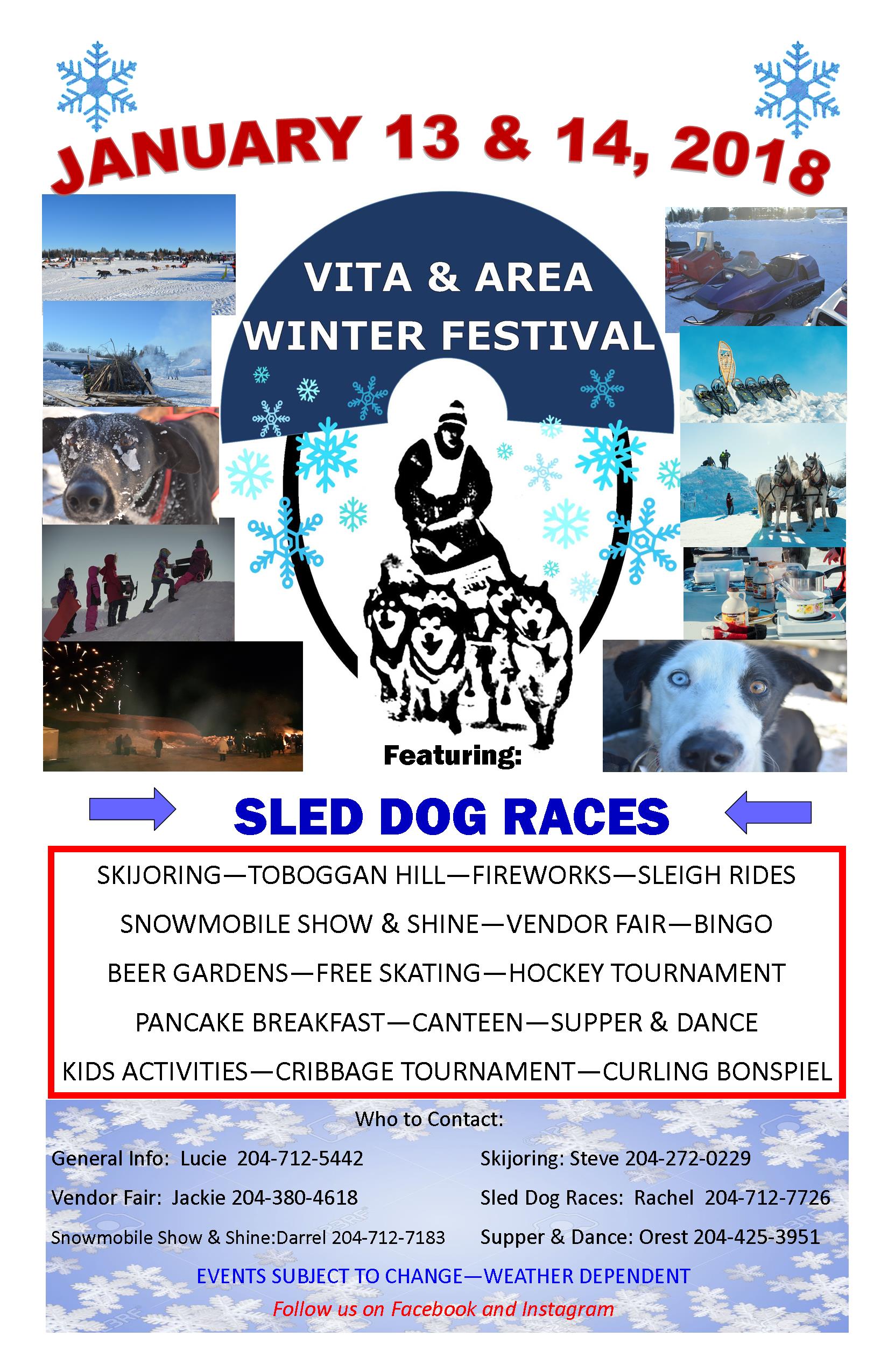 Vita & Area Winter Festival is a family fun two day event held in Vita, MB. The festival features 10 dog and 6 dog races on both days. New this year there will be skijoring – one and two dog races. Other events to enjoy are toboggan hill, free skating, maple taffy making, bannock making, sleigh rides, vintage snowmobile show n shine, vendor/craft fair, bingo, cribbage tournament, beer gardens, hockey tournament, curling bonspiel, pancake breakfast, canteen food, supper & dance, huge fireworks show.
