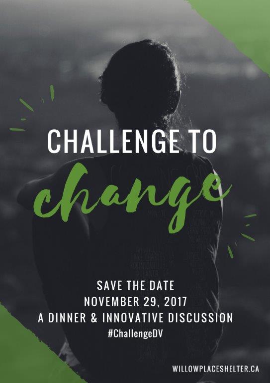 News Release For Immediate Release: November 22, 2017 “Challenge to Change” A Social Innovation Lab and Dinner on Family Violence. Family violence is a pervasive and persistent experience in Canada today. Manitoba continues to have the second highest rate of police-reported family violence among the provinces (Statistics Canada, 2015), and the number of people it affects continues to grow. Help us change this picture by joining us on November 29th at the Fairmont Hotel. This second annual event is hosted by Willow Place, Manitoba’s largest shelter for women and their children who are experiencing family violence. “Challenge to Change” is an invitation to public sector and political leaders, community service providers, our business community, service organizations, men and women with lived experience and citizens who care to come together to build on existing services and initiatives and identify strategies for mobilizing the energy and support necessary to end violence in Manitoba. Hear about the three year “Challenge to Change” project, initiated by Willow Place, supported by Status of Women Canada and lead by a community/public sector Steering Committee. The goal of the project is to modernize the systems that support those experiencing family violence and to deepen the public’s understanding of this complex issue. Participants will learn more about this ground breaking project and hear from people who have experienced family violence, used violence within the family or witnessed violence as a child. Please join us for dinner and then take part in an interactive “social innovation lab” that will enable participants to choose their conversation and identify the barriers, opportunities and solutions that will put an end to family violence. The ideas that are generated during the “social innovation” lab will be incorporated into the “Challenge for Change” project. The Honorable Rochelle Squires, Minister of Sustainable Development and Manitoba Status of Women will bring opening remarks. Doors open at 4:00 and the program begins at 5:00 PM. Tickets are $35.00 and may be purchased on the Willow Place website at willowplaceshelter.ca or https://www.eventbrite.ca/e/challenge-to-change-tickets-39300332352?aff=affiliate1