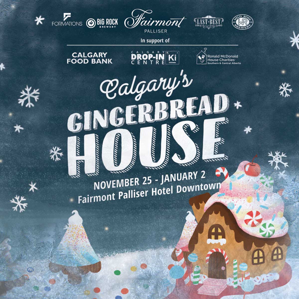 Event EndedCome see a free life size gingerbread house and support local non-profits in the lobby of the Fairmont Palliser. All monetary donations will go to the Calgary Drop-In Centre and food donations will go to the Calgary Food Bank. On the interior of the house, be sure to write wishes down for families at the Ronald McDonald House Southern Alberta. Wild Rose Brewery, Last Best Brewing Company, and Big Rock Brewery will be granting three wishes.