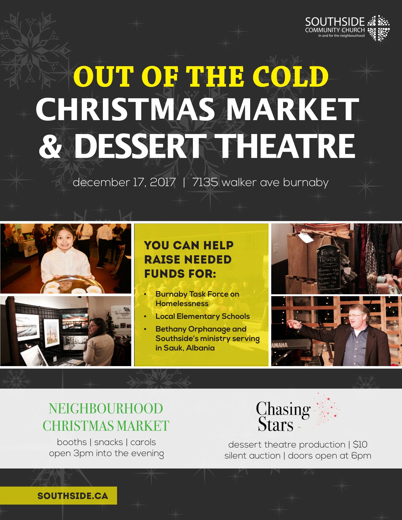 New to this year’s Out of the Cold is a free neighbourhood Christmas Market from 3-8pm. Bring family and friends of all ages to stroll the booths, enjoy holiday treats and purchase quality good from local artisans and businesses, all for a good cause! There will be music, drinks, snacks and more! Following the craft fair, there is a dessert theatre production and silent auction. Tickets for this portion of the event can be purchased for $10. This is a fundraising event. This year’s proceeds go towards The Burnaby Task Force on Homelessness, several local elementary schools, and a children’s orphanage in Albania!