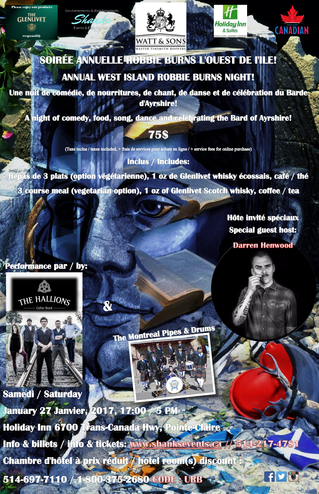 This is an annual event which celebrates one of Scotland’s most famous individuals Robert Burns. This annual celebration has been growing in popularity with sold out crowds each year! Due to such popularity we have moved and expanded the event to the elegant reception hall of the Holiday Inn in Pointe-Claire.