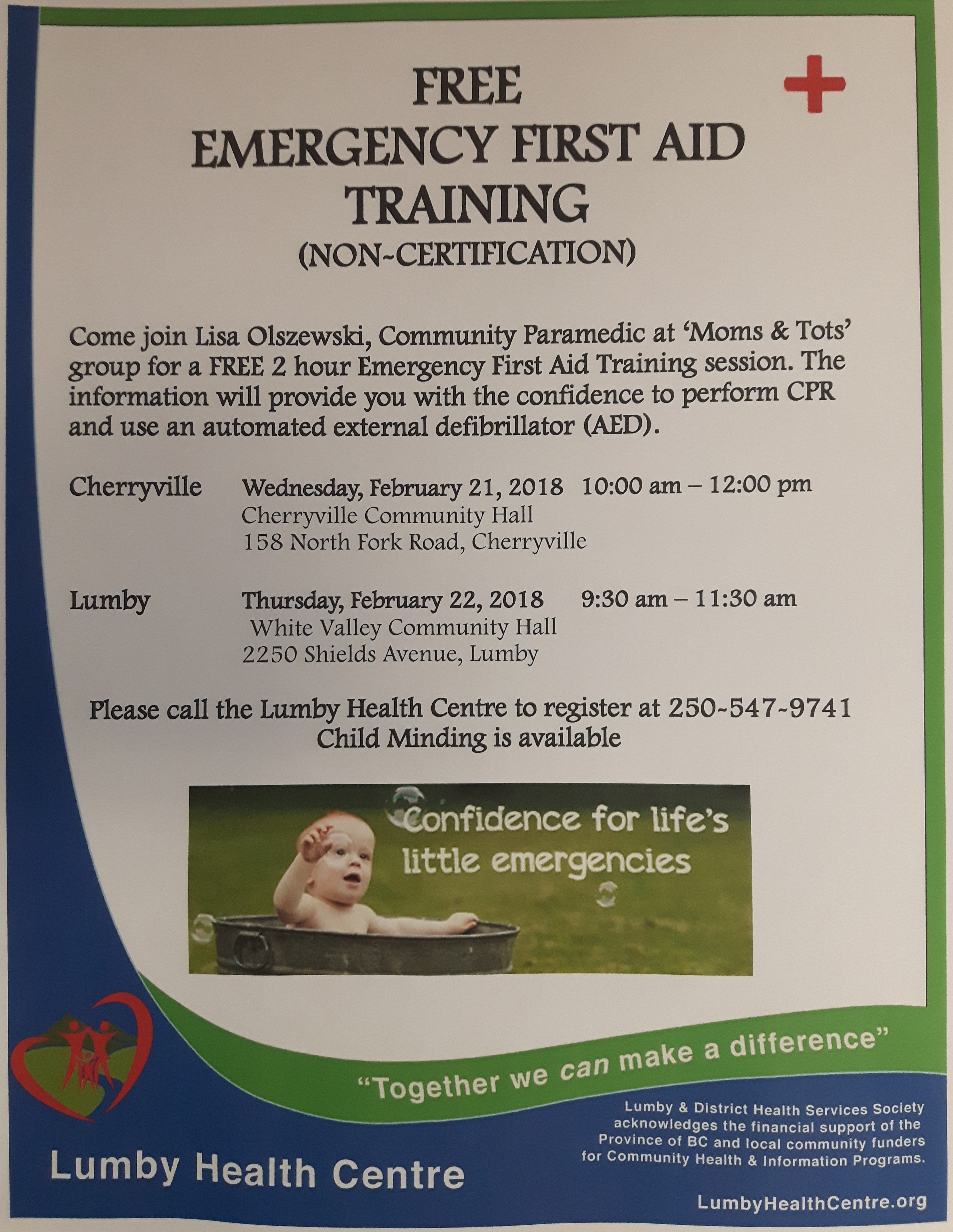 Come join Lisa Olszewski, Community Paramedic at ‘Moms & Tots’ group for a FREE 2 hour Emergency First Aid Training session. The information will provide you with the confidence to perform CPR and use an automated external defibrillator (AED). Cherryville: Wednesday, February 21, 2018 10:00 am – 12:00 pm Cherryville Community Hall 158 North Fork Road, Cherryville, BC Lumby: Thursday, February 22, 2018 9:30 am – 11:30 am White Valley Community Hall 2250 Shields Avenue, Lumby Please call the Lumby Health Centre to register at 250-547-9741 Child Minding is available