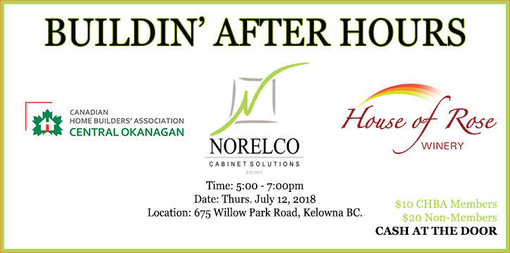 The Canadian Home Builders’ Association of the Central Okanagan invites you to a relaxing evening of Business networking at Norelco Cabinets. Joining us will be House of Rose Winery. This is a great casual way to meet and network with members of the Okanagan’s building industry. Invite friends, colleagues, and business associates to Norelco Cabinets and say hello to current friends and make some new connections. CHBA Members: $10 Non-Members: $20 CASH ONLY