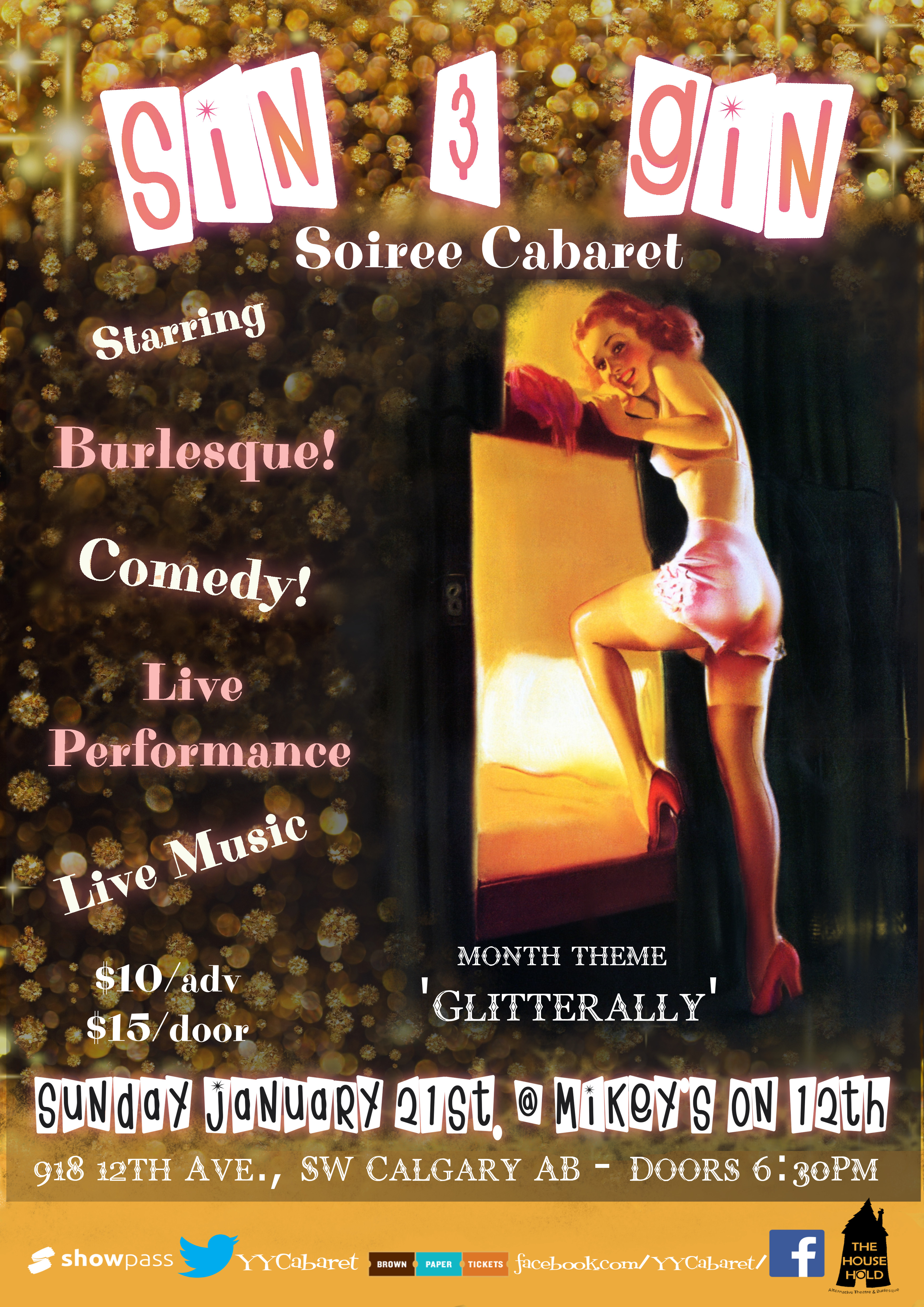 Sin & Gin is filled with Comedy, Music, Dance, Burlesque, Cabaret and more! As we enter 2018 we ‘Glitterally’ want to invite you to an evening filled with local and out of town entertainment. This is a perfect evening for your event – Birthdays, Anniversaries, Bachelor/Bachelorettes, and anything that you want to do to take a break from month. Be ready to partake of the amazing talent that Calgary and Alberta has to offer. This month we have Live Music, Burlesque, Comedy and Cabaret. Book online to reserve your front seat! Or dare to take a chance at the door! Stay tuned to the event page as we share with you who is gracing the Sin & Gin stage ‘Glitterally’ this month! Sunday January 21st, 2018 – Mikey’s on 12th, 918 12th Ave Sw, Calgary AB Doors 6:30pm – Show 7:00pm Tickets: $10 adv – online/Mikey’s – $15 door Online links: https://sinandginglitterally.bpt.me/ https://www.eventbrite.ca/e/sin-gin-soiree-cabaret-glitterally-tickets-41897227736