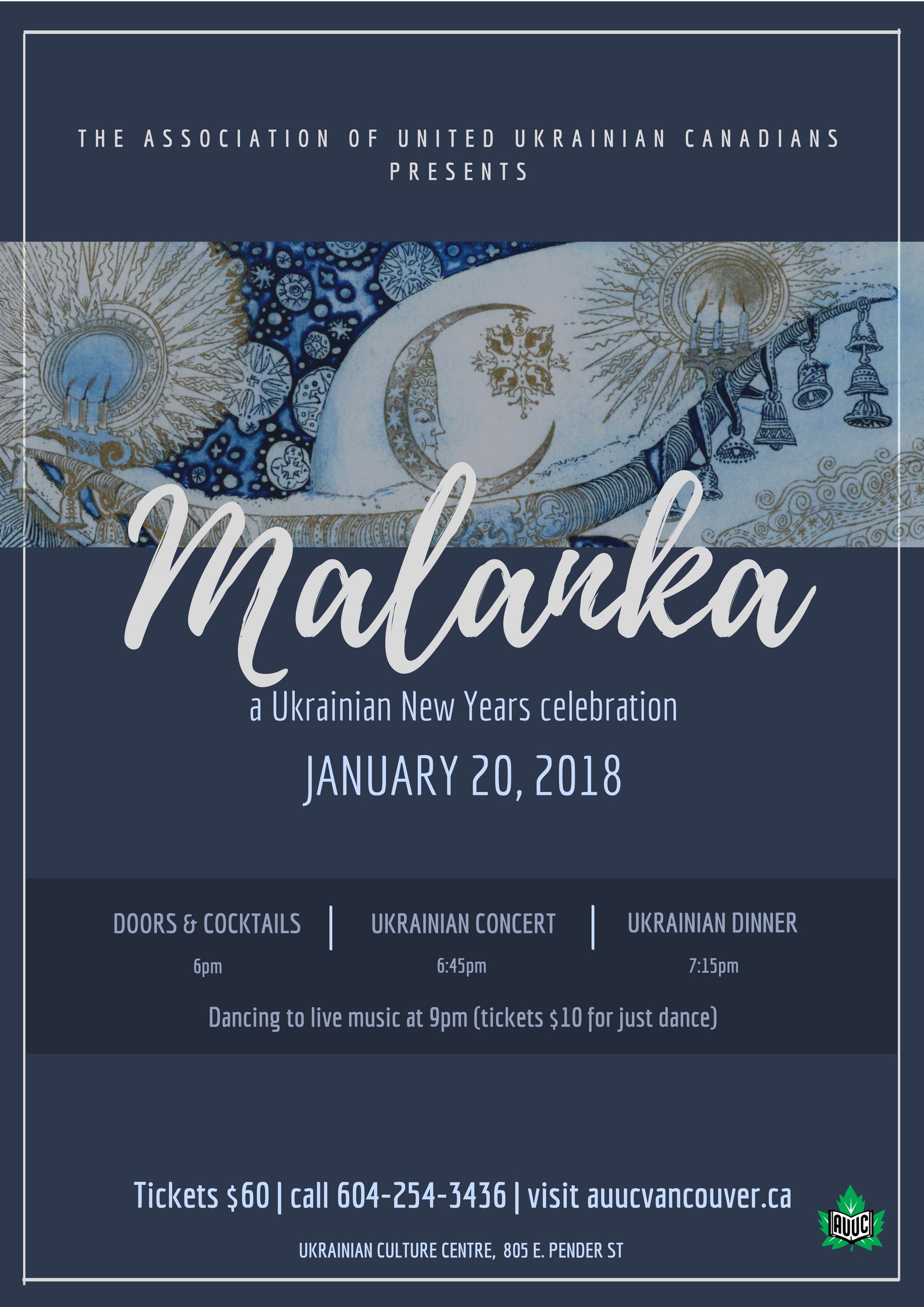 New Year’s celebration isn’t quite over. Come celebrate Ukrainian New Year (Malanka). There will be great food, entertainment, and dancing. Bring a group of friends. Make new friends. There will be a limited amount of tickets available so purchase them early to avoid disappointment. Call 604-254-3436 to purchase your tickets.