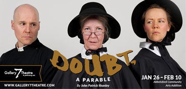 Sister Aloysius, a Bronx school principal, is shaken to her moral core when she suspects that young Father Flynn is having an inappropriate relationship with a male student. A Pulitzer Prize-Winning play that was adapted in to an award-winning film featuring Meryl Streep and Philip Seymour Hoffman, the play explores the delicate tension between perception and reality. Runs January 26 – Feb. 10 at the Abbotsford Community Arts Addition, 2329 Crescent Way, Abbotsford. Written by John Patrick Shanley. To purchase tickets in person or by phone, visit House of James, 2743 Emerson Street, Abbotsford, 604-852-3701 or 1-800-665-8828. To purchase tickets online, visit http://www.gallery7theatre.com.