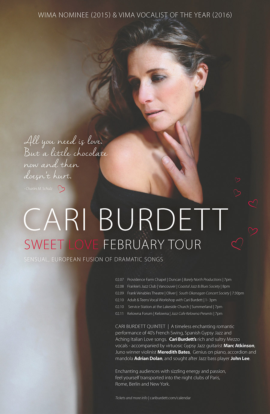 Be transported to the night clubs of Paris, Rome, Berlin, and New York with the Cari Burdett Quintet. Cari’s mezzo vocals will be accompanied by an all-star band, including guitarist Marc Atkinson (The Bills, Marc Atkinson Trio), Juno-winning violinist Meredith Bates, genius on Piano, accordion and mandola, Adrian Dolan (The Bills, the Rankin Sisters, Barney Bentall) and sought-after jazz bass player John Lee (George Colligan, Brad Turner, Ingrid Jensen, and Cyrus Chestnut) Enjoy this enchanting performance of 40’s French Swing, Spanish Gypsy Jazz and aching Italian Love songs, just in time for Valentine’s day.