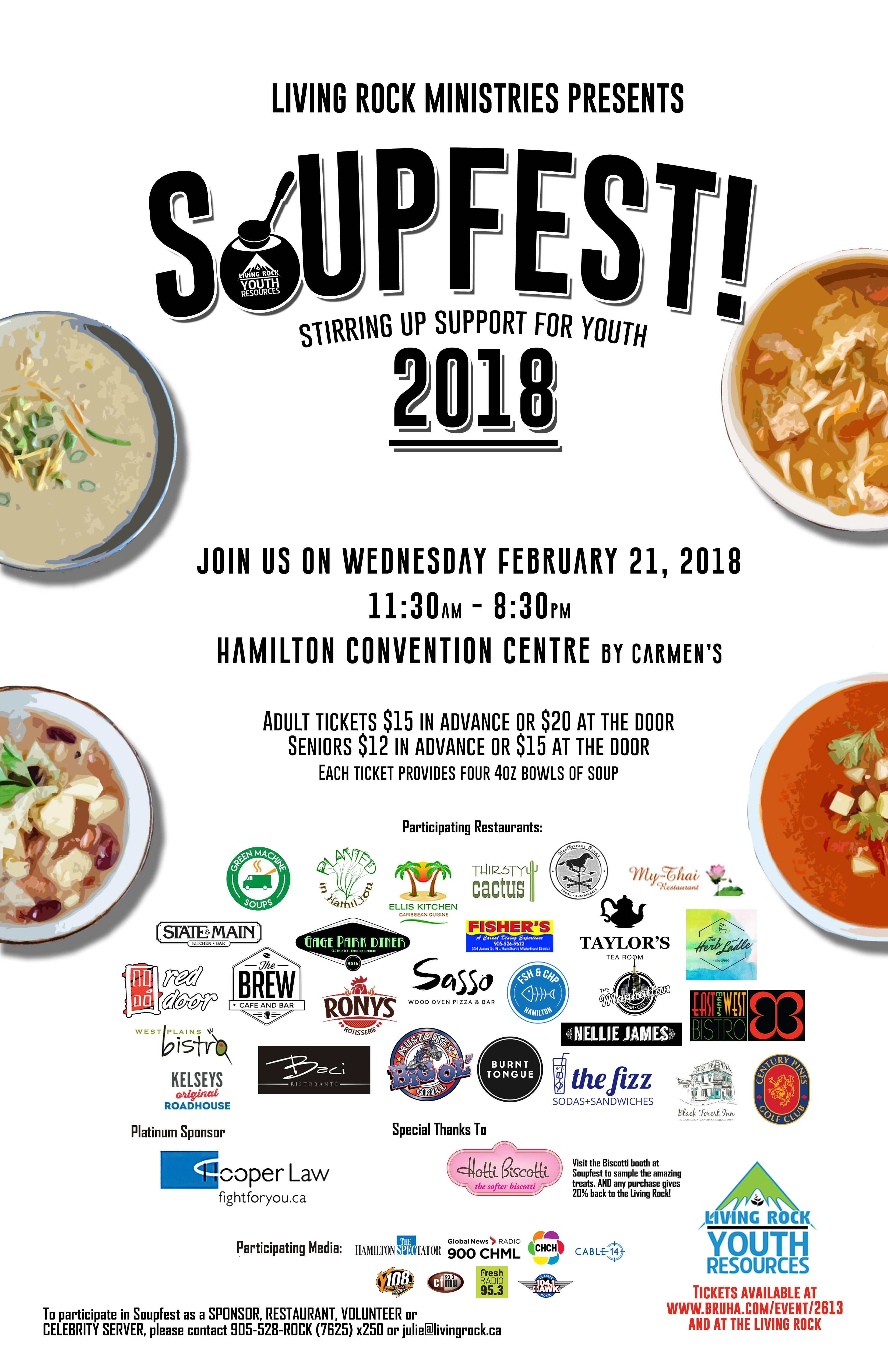 HAMILTON, ON – January 8th, 2018 – As the New Year begins; the excitement for Living Rock’s Soupfest 2018 is starting to heat up! Wednesday, February 21st, 2018 will mark the 16th annual fundraising event to stir-up support for youth. Living Rock has been engaging, encouraging and equipping youth for 32 years; through supports and programs that meet immediate needs in addition to providing training and mentorship.