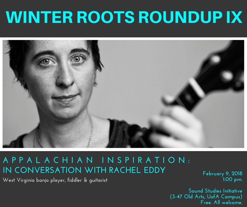 The Winter Roots Roundup festival remains committed to exploring aspects of music’s multifaceted role in shaping our world outside of the concert setting. On February 9th at 1:00 pm we will host a free preview event at the Sound Studies office with West Virginia banjo player, fiddler, and guitarist Rachel Eddy. During this event Rachel will speak about the history of the old-time banjo tradition and perform for us in an intimate setting.