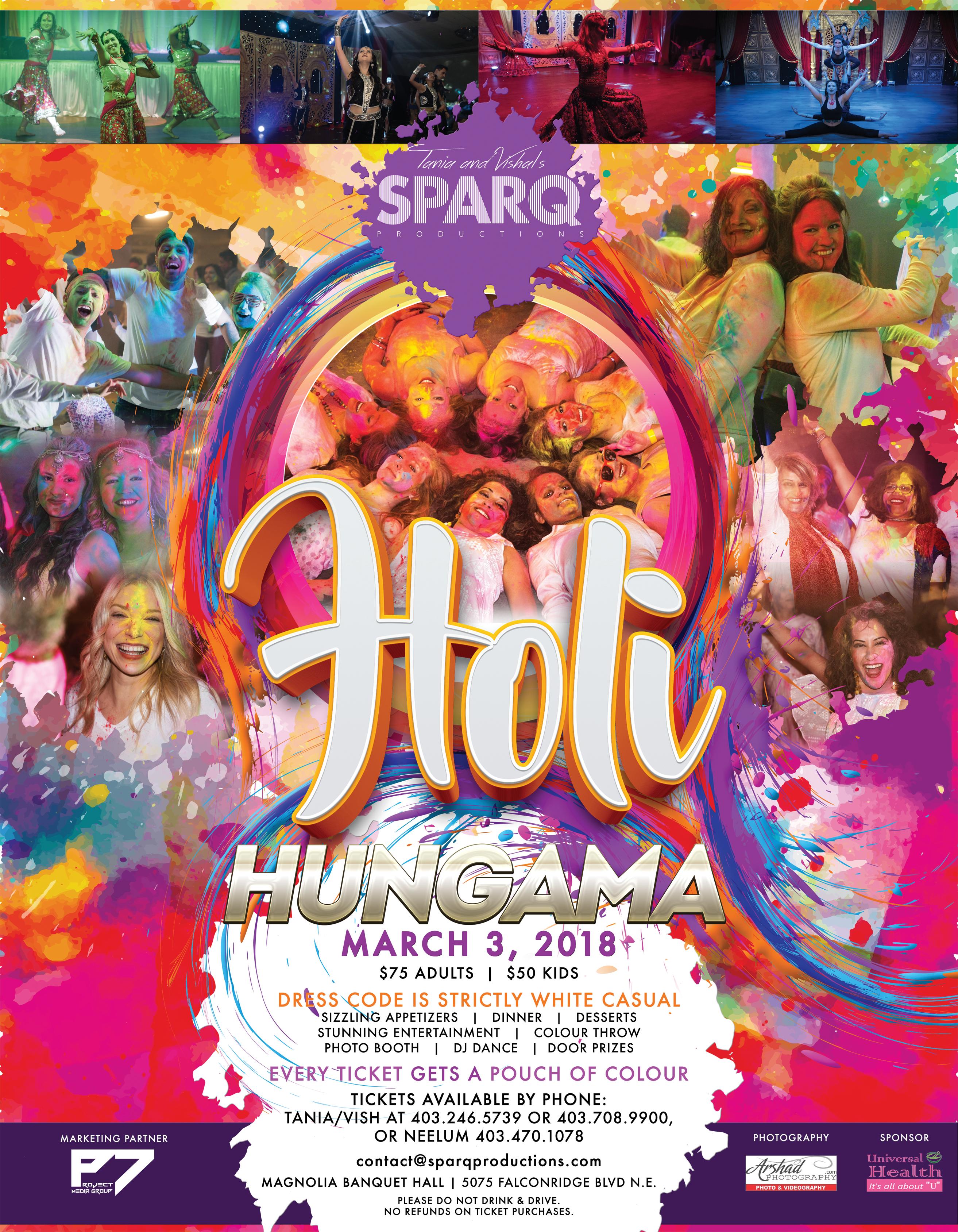 SPARQ PRODUCTIONS is proud to present the 4th Annual HOLI HUNGAMA 2018!!! This year we will be CELEBRATING FREEDOM!!! The event last year was SOLD OUT and we had to unfortunately decline a lot of people. Please book your tables early to avoid dissappointment!! THE ONLY COLOURFUL PARTY IN TOWN!!! LET’S PLAY HOLI!!!!! COME & CELEBRATE LIFE WITH COLOUR!!! * STUNNING ENTERTAINMENT * EVERY TICKET GETS A BAG OF COLOUR * MUSIC & PERFORMANCES * DJ & DANCE * APPETIZERS * Delicios East Indian DINNER * DESSERTS * AND A WHOLE LOT OF COLOUR!!!! Dress Code: STRICTLY WHITE CASUAL (please wear something that you are not so attached to as you will be playing HOLI – throwing of dry colour powder. That could be a great souvenir to remind you of the great time you will have had at the event!!!!) MARCH 3 2018 MAGNOLIA BANQUET HALL 7PM ONWARDS Adults: $75 Kids (4-10) $50 Email: contact@sparqproductions.com Some highlights from the last year’s event https://www.youtube.com/watch?v=L_czV-7Wsno ****PLEASE DO NOT DRINK & DRIVE***** ****NO REFUND ON TICKET PURCHASES**** About the colour The Holi colour will be an environmentally friendly product, non toxic, biodegradable and skin safe according to the vendor
