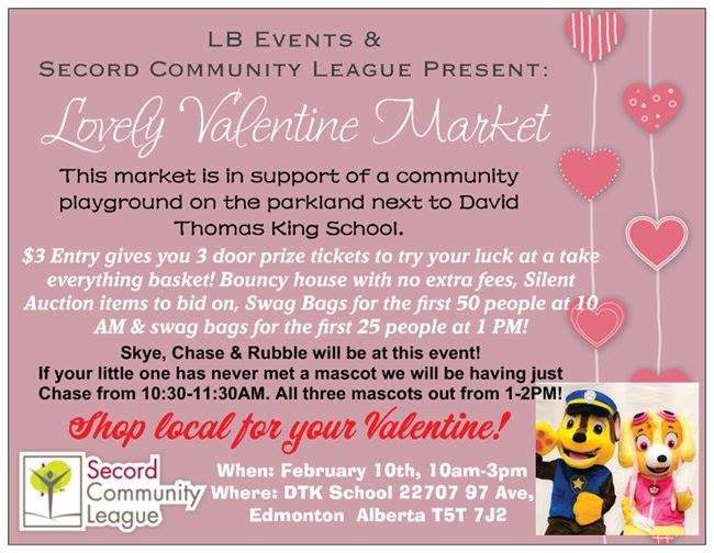 Lovely Valentine Market in support of a community playground on the parkland next to David Thomas King School. Come support our local community and shop for gifts with our amazing local vendors! We guarantee you will find something for any Valentine at this market! $3 Entry gets you in and with 3 door prize tickets to try your luck at a take everything basket! There will be a bouncy house with no extra fees to bounce on, silent auction items to bid on, Swag Bags for the first 50 people at 10 AM and swag bags for the first 25 people at 1 PM! ALL PROCEEDS FROM THIS MARKET WILL BE DONATED IN SUPPORT OF A COMMUNITY PLAYGROUND ON THE PARKLAND NEXT TO DAVID THOMAS KING SCHOOL, LOCATED IN SECORD, A GROWING NEIGHBORHOOD IN WEST EDMONTON. Now booking vendors spaces are $50 Confirmed Vendors Arbonne Cynful Sweets Daryl Lang Jewelry Juice Plus+ Joy Gemstones Little Boutique Mir & House Miss Missy’s Tea and Sundries Mojilife Norwex Old School Bath & Body OS Kampot Pepper Origami Owl Page Turners Bookshop Phil’s Fudge Factory Purple Zebra Pruvit KETO OS and MAX Rainbow Systems Rodan & Fields Rolex Tin & Metal Works Sparkle Tattoo St Albert Slime Sweet Convenience Sweet Legs Sunset Gourmet The Woof Shop Thrive Life Toteli-n-dulgence with Mellisa (Thirty-One Tupperware Wooded Trails & Berry Pails Usborne Books/3 Little Hearts Booktique Vibrant Designs Vintage and Varnish Voxxlife Younique