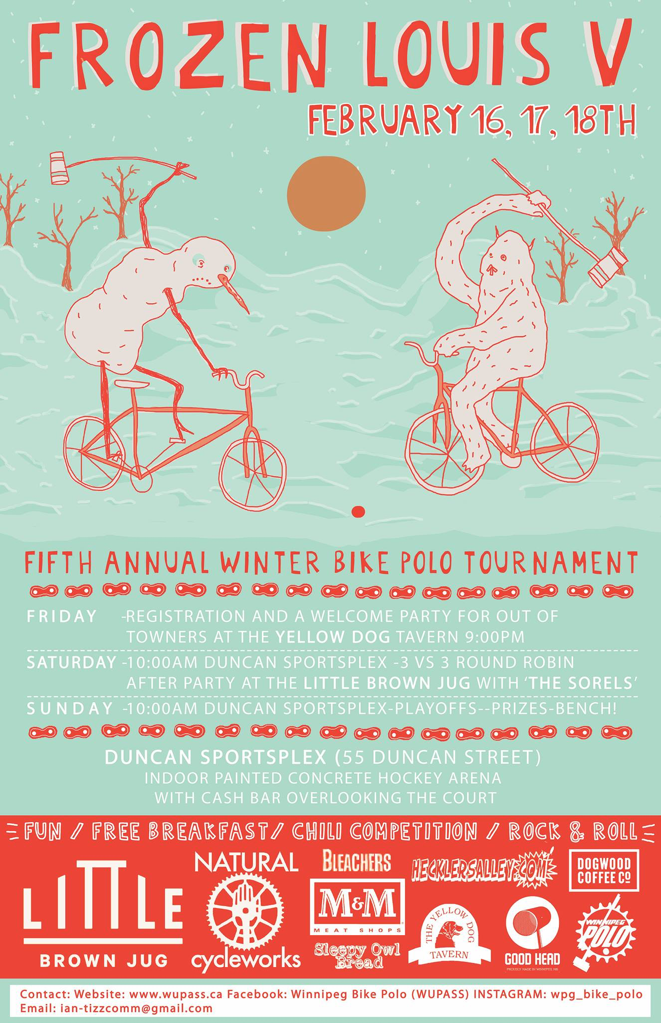 Winnipeg Urban Polo Association is proud to present the 5th annual Frozen Louis bike polo tournament at Sportsplex Arena, February 17-18! Friday night registration party at The Yellow Dog! Saturday 3v3 Round Robin! Saturday night rock’n’roll party with The Sorels at Little Brown Jug! Sunday playoffs and bench mix-up! Player registration is $75 per team and includes food and snacks through the weekend. We also offer billeting, prizes, and appropriately monitored heckling. Spectators welcome! Come find out what bike polo is all about! https://www.facebook.com/events/174612716640821/