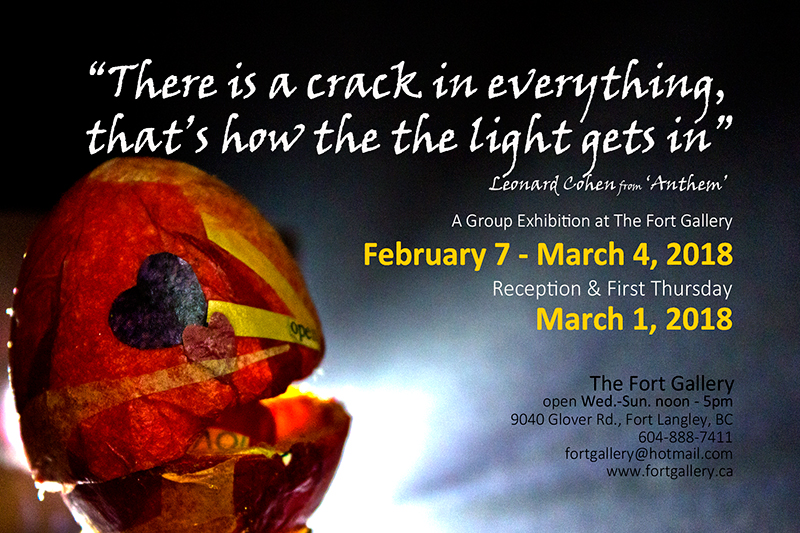 As most of us are realizing more deeply, we are living in challenging times. We see the effects of climate change, violence around the world and displacement of families and populations due to political chaos and war. We hear of ever hardening points of view, human rights abuses and discrimination. We long to find ways to encourage our hu-manity, understanding and caring. We long to see through the cracks to the light we know shines for us all. One of the promises of art has been to reflect for us both our realities and our pathways forward. As George Bernard Shaw wrote: “You use a glass mirror to see your face; you use works of art to see your soul.” February 7-March 4, members of The Fort Gallery present a group show that considers these realities, (both pitfalls and promises of our times), in light of Leonard Cohen’s An-them lyric: “There is a crack in everything. That’s how the light gets in.” The public is warmly invited to a reception, held in conjunction with March First Thursday, which will be held March 1st, 7-9pm. Gallery hours are Wednesday to Sunday, noon-5pm The Fort Gallery, 9048 Glover Road, Fort Langley 604-888-7411 fortgallery.ca Twitter: @FortGallery Facebook: https://facebook.com/fortgallery