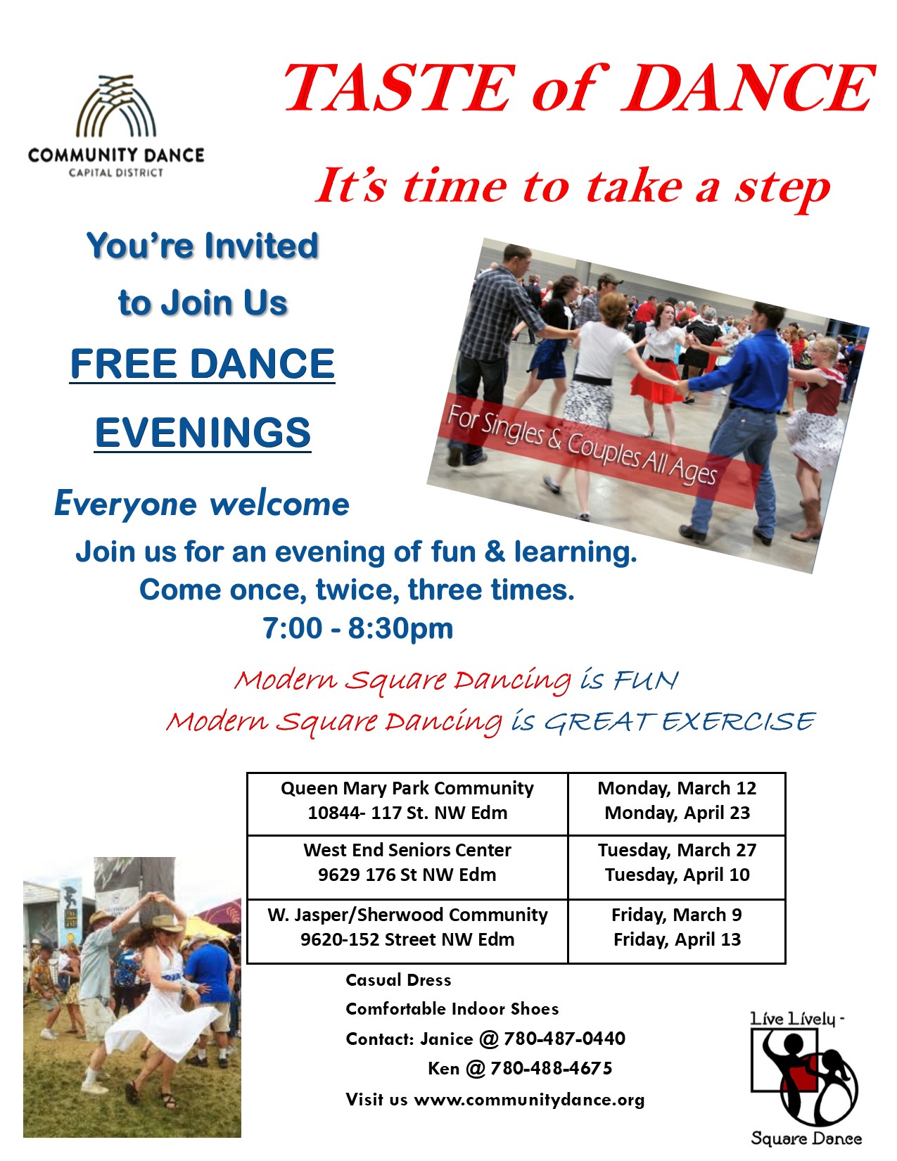 Try Modern Square Dancing – great exercise & fun. 3 locations, 6 dates. Come for one, two, three or more. Everyone Welcome! See our poster for all the information or call Janice @ 780-487-0440 or Ken @ 780-488-4675. Mainstream dancers also welcome. It’s Time to Take a Step. Casual wear & comfortable shoes is all you need. Queen Mary Park Community 10844- 117 St. NW Edm Monday, March 12 and Monday, April 23 West End Seniors Center 9629 176 St NW Edm Tuesday, March 27 and Tuesday, April 10 W. Jasper/Sherwood Community 9620-152 Street NW Edm Friday, March 9 and Friday, April 13