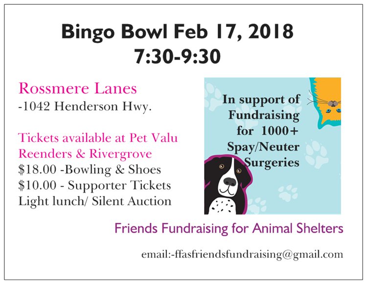 Fundraising Bingo Bowl to support spay/neuter clinics for cats and dogs in Manitoba. Friends Fundraising for Animal Shelters Inc. Tickets $18.00 for bowling, shoes, light lunch $10.00 -supporter tickets. Tickets available at Pet Valu Reenders/Rivergrove and McPhillips