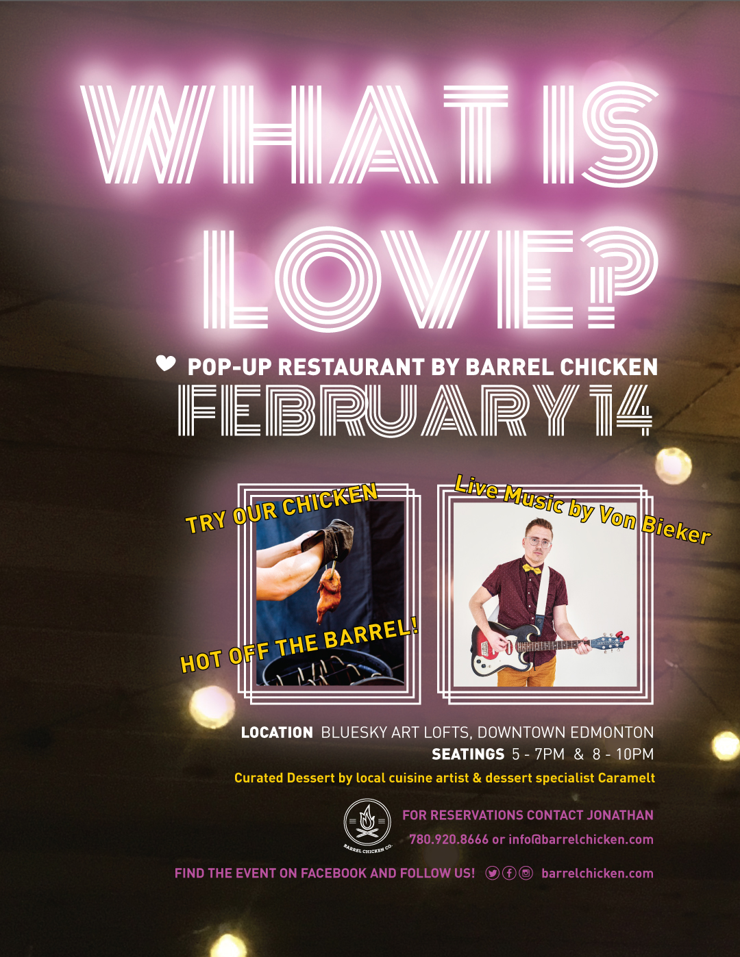 Smoked Meat Popup on Valentines Day Barrel Chicken pulls it’s meat out this Valentines Day. On Wednesday, February 14th Barrel Chicken is hosting an unforgettable evening that questions, “What is Love?” with two seatings between 5PM and 10PM, taking place in a new popup event space at the Blue Sky Art Lofts, downtown Edmonton. Are you ready for a new flavour of Alberta Smoked BBQ? We’ve got you covered! This evening we’ll be serving up three new Alberta inspired recipes to enjoy with your sweetheart. Your evening begins with a crispy glass of bubbly and a tasty appy at the door. Mozzy about and check out the $500 gift give away prize while mingling with new Edmonton foodie friends. Once you make your way to your seat, you’ll enjoy the sweet sounds of Dave Von Bieker playing his original songs to get you pumped for what’s next! A three course meal straight off the barrel with smoky sweet flavours to challenge your taste buds. Starting with a cherrywood kissed asparagus fried quinoa salad tossed in a black olive vinaigrette. Next up you’ll try our famous Barrel Smoked Chicken with a twist, a breast stuffed with homemade Chorizo and topped with caramelized pear, tomatino salsa, paired with a southwestern style stuffing. To finish off the evening a shared dessert, curated by local cuisine artist – dessert specialist Caramelt. Tickets are available $130 a pair or $75 per. Guests receive one drink ticket each. Beer is graciously provided by Big Rock brewery and our bartender has a carefully selected wines along with a featured cocktail. For more information visit our Facebook Page for the What is Love? Event. Contact Jonathan at 780 920 866 for reservations. Limited seating available. Nothing shows your love more than Alberta smoked meat.