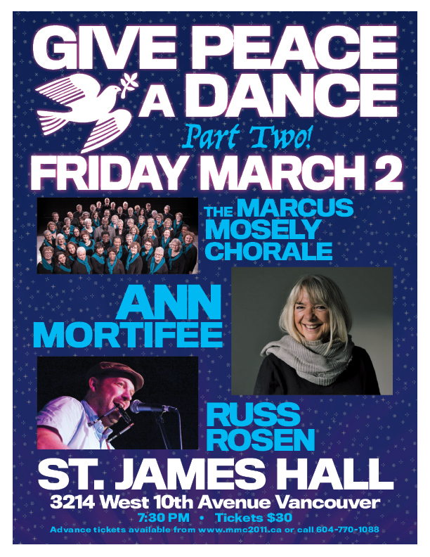 Back by popular demand, “Give Peace a Dance” returns to St. James Hall on Friday, March 2nd. This event, featuring the Marcus Mosely Chorale and special guests Ann Mortifee and Russ Rosen, will offer lots of great singing and a chance to dance up a storm. “The world is a scary place right now” explains Mosely. “As a child of the 60’s I remember the sense of community, compassion, and care for the world that was so closely linked to the music, and the way we would feel that soul and hope move right through our bodies. I wanted to find a way to bring that spirit back to present day. If ever there was a time we needed to come together in peace and hope, it’s now.” The show starts at 7:30. Tickets are $30 and can be obtained through the Marcus Mosely Chorale website (mmc2011.ca) under “events”, or by calling the ticket hotline at 604 770-1088.