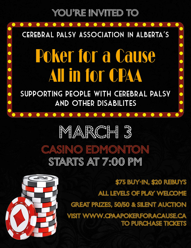 It’s time to put on your poker faces and hold your cards tight, as the Cerebral Palsy Association in Alberta announces their 2018 Edmonton Poker Tournament. Join the fun, as all levels of play are welcome! The buy-in is just $75. Re-buys available throughout the night. There will be great prizes for the Top 3 Winners including a 1st Place Grand Prize of $500. There will also be other great ways to win including a 50/50. Proceeds from this event support individuals with cerebral palsy and other disabilities.