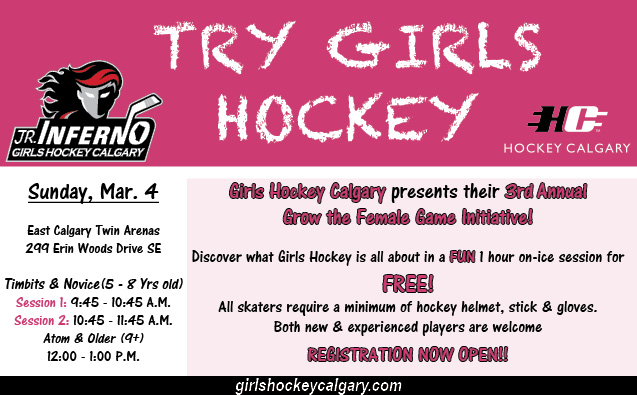 Jr. Inferno / Girls Hockey Calgary is looking for girls who would like to try playing GIRLS hockey. This free event is being held on Sunday March 4 for girls between the ages of 5 and 17. We are offering 3 sessions. To register head to the Hockey Calgary website or for more information about this great game head to Girls Hockey Calgary website.