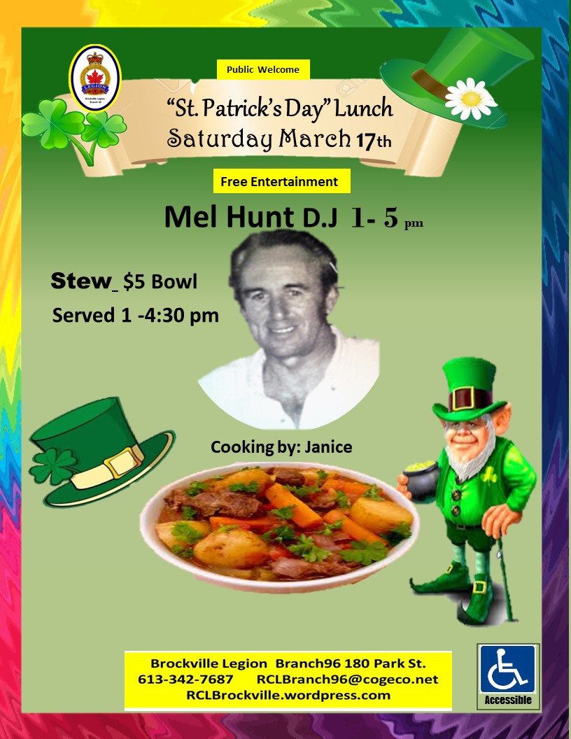 Come celebrate your Irish spirit on March 17th in the lower lounge at the Brockville Legion from 1-5pm.