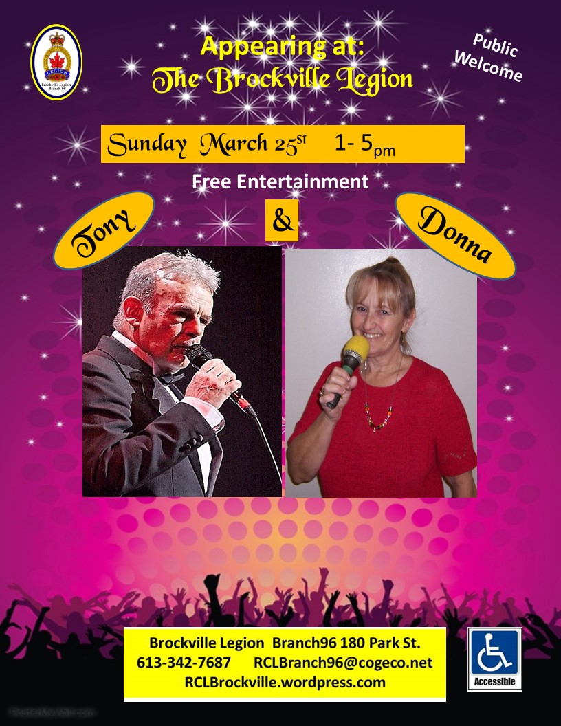 Live entertainment by “Tony & Donna” in the lower lounge of the Brockville Legion from 1-5pm on March 25th. FREE admission. Public welcome.