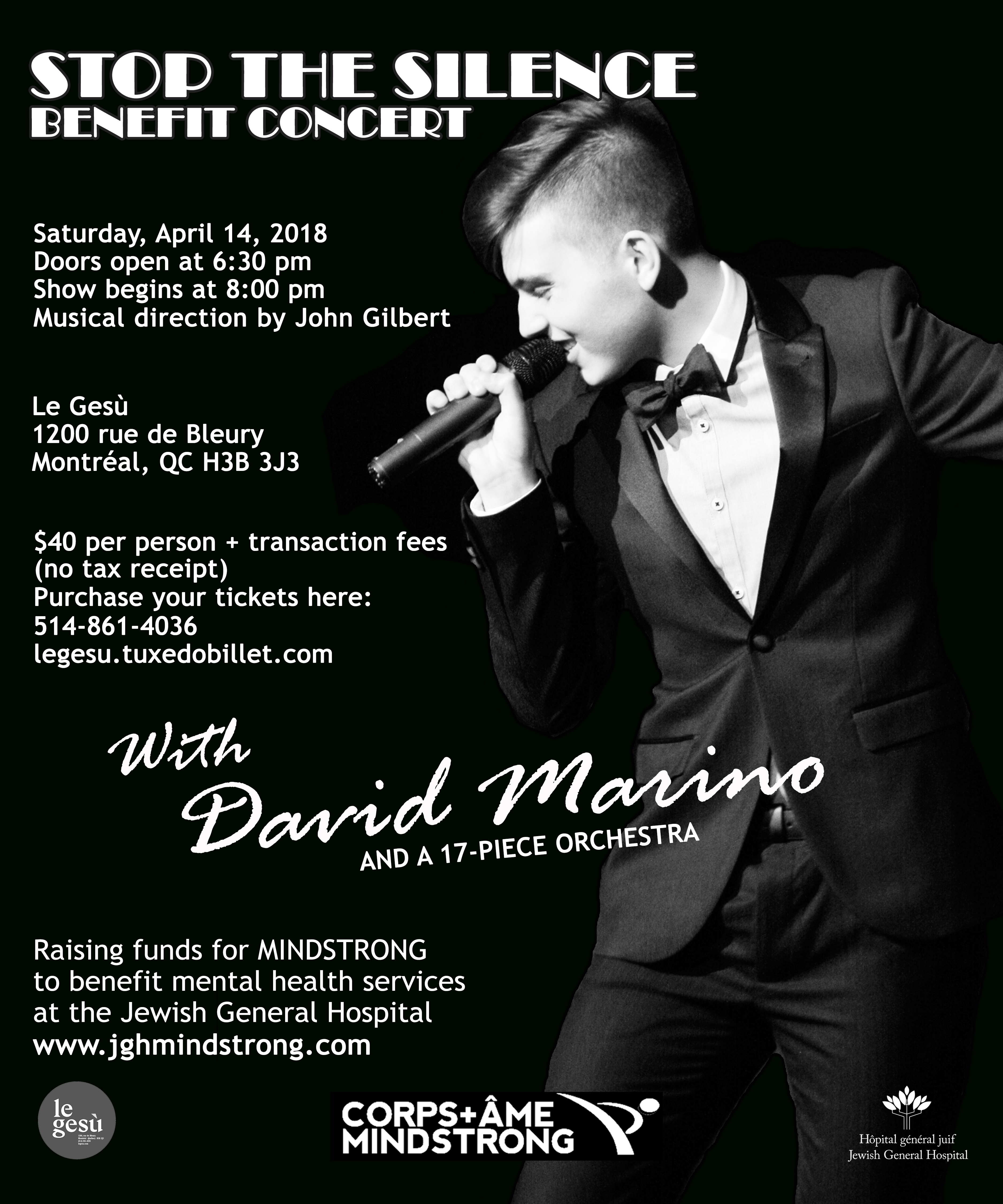 Concert featuring David Marino (finalist on La Voix season 5) and a 17-piece orchestra to benefit mental health services at the Jewish General Hospital. Tickets can be purchased online at legesu.tuxedobillet.com or at 514-861-4036. Doors open at 6:30pm, show begins at 8:00pm.