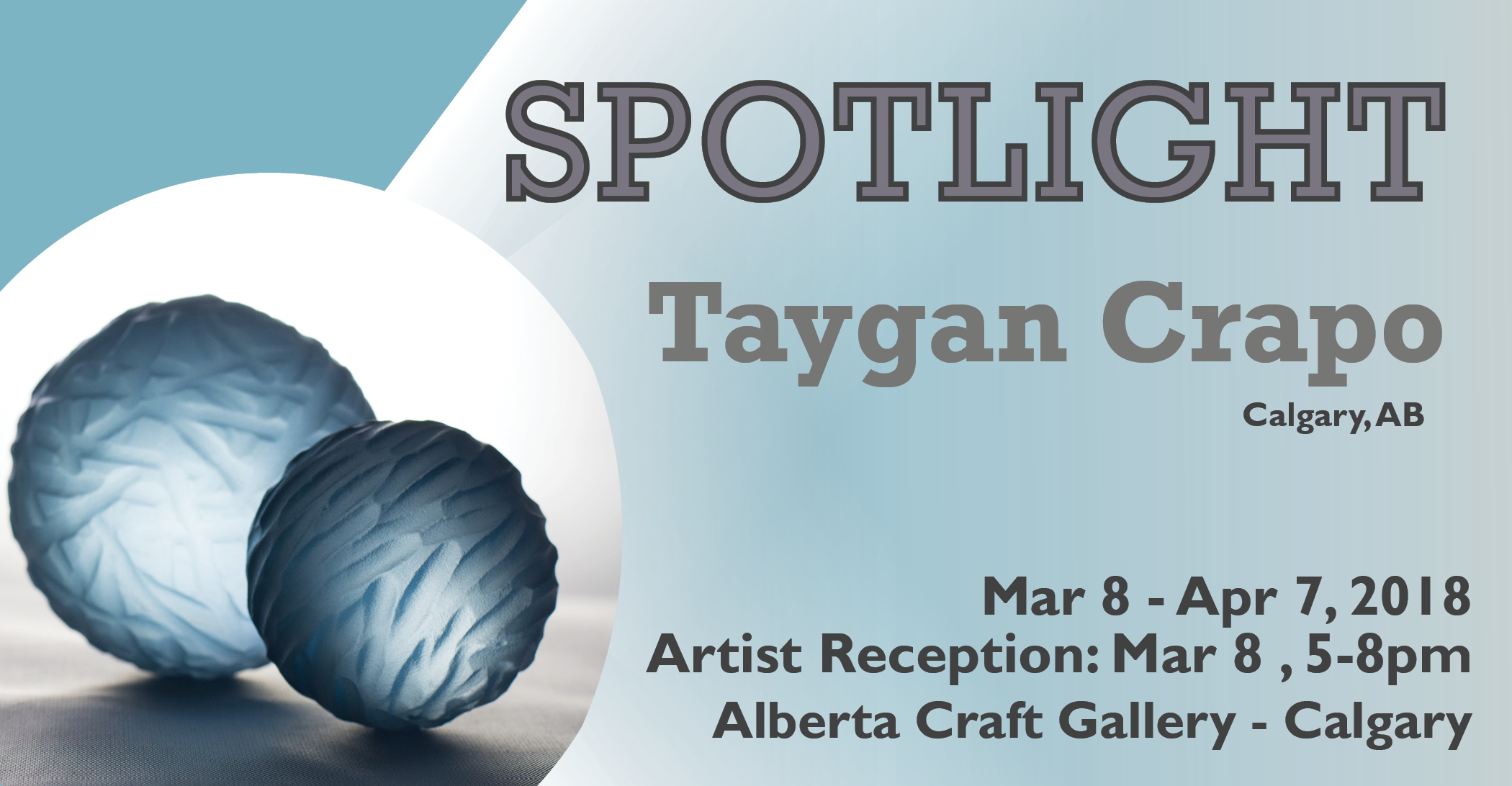 SPOTLIGHT – Taygan Crapo, Glass March 8 – April 7 Opening Reception: March 8 (5-8 PM) Alberta Craft Gallery – Calgary 2nd Floor, cSPACE – King Edward 1721 – 29 Avenue SW, Calgary SPOTLIGHT features artists who are exploring new techniques, launching or testing a new product line, or are new to the Council. A member and invited guest reception will be held March 8 (5-8 PM) Taygan’s work is “conceptually centered on phenomenology, landscape, and the reveries that are found through exploring the textures and movement of glass. Inspired by muscle tissue, the pulled sculptures are created from a molten state and are derived from trapping air and pulling the bubbles into long strands. The crystal pondering stone patterns are inspired by the landscapes that I have travelled and call home.”