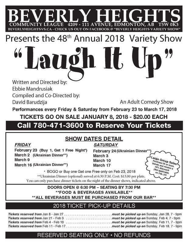 Event Details This is an evening of Adult comedy taking place Friday and Saturday evenings from February 23 through March 17th Doors open at 6:30 pm, seating by 7:30 pm. This event has carried on every winter for the last 48 years. This year a Ukrainian Dinner will be available for $13 on the evenings of February 24th, March 2nd and March 16th. The February 23 & 24, 2018 shows had very good reviews, a must see!!! Type of Event Comedy Region Greater Edmonton Area Age Range Adults Cost Admission of $20.00 per person Contact Name Directions Travel East on Yellowhead Highway to the exit for 50th Street South; along 50th Street continue to 114th Avenue and turn Left. Continue down 114th Avenue to 42nd Street and turn Right onto 111th Avenue.