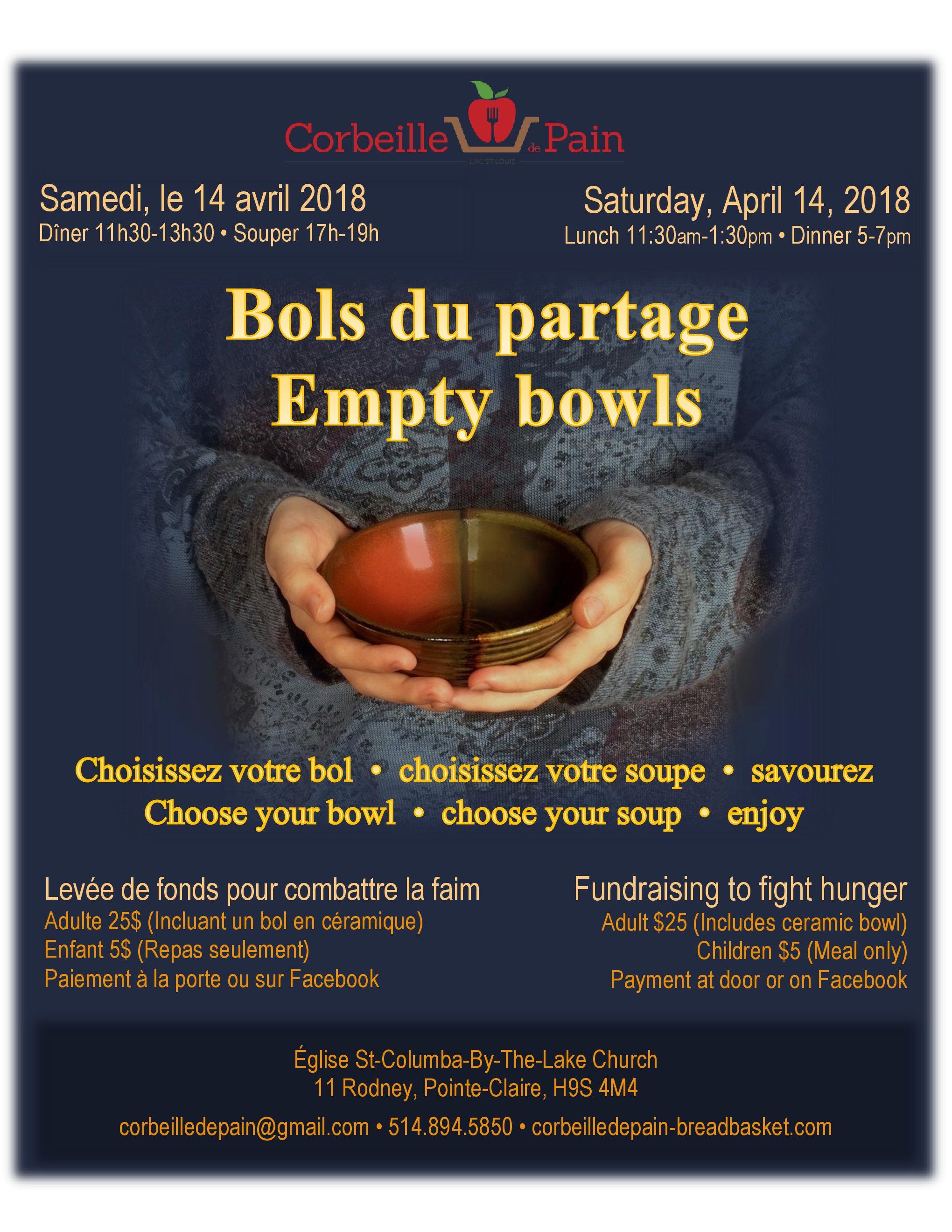BOLS DE PARTAGE Aidez-Nous à Partager la Mission de Corbeille de Pain pour Combattre la Faim Vous êtes inviter à l’Église St-Columba-By-The-Lake de Pointe-Claire pour l’activité de levée de fonds ” Bols de partage ” organisé par Corbeille de Pain Lac St-Louis. Les fonds récoltés seront remis à l’organisme Corbeille de Pain pour venir en aide aux populations vulnérables de l’Ouest-de-l’Île en faisant la promotion et l’éducation de la sécurité alimentaire. QUOI : Les participants pourront choisir et déguster une savoureuse soupe maison servie dans de magnifiques bols en céramique faits à la main par des artisans locaux. En échange du prix d’entrée, les participants garderont le bol qu’ils auront choisi, un symbole de tous les bols vides dans le monde. QUAND : Le samedi 14 avril 2018 de 11h30 à 13h30 (dîner) et de 17h à 19h (souper) OÙ : Église St-Columba-By-The-Lake (11 rue Rodney, Pointe-Claire, H9S 4M4) Les billets pour cette activité sont en vente au coût de 25 $ par adulte (comprenant un bol en céramique ainsi que le repas) et de 5 $ par enfant (pour le repas seulement). Il est possible de se procurer les billets à la porte le jour même, ou encore sur la page Facebook de Corbeille de Pain : https://www.facebook.com/CorbeilleDePainBreadBasketLacSaintLouis/ EMPTY BOWLS Help Spread Bread Basket’s Mission to Fight Hunger You are invited to the Bread Basket Lac St-Louis fundraising activity “Empty Bowls”. Profits from this event will be given to Bread Basket Lac St-Louis in order for them to help the West Island’s vulnerable population by promoting and educating people about food security. WHAT : Guests will be able to choose and enjoy a savoury homestyle soup served in a handmade ceramic bowl made by local potters. In exchange for the entrance fee, participants can keep their chosen bowl as a symbol of all the empty bowls throughout the world. WHEN: Saturday, April 14, 2018 from 11:30 am to 1:30 pm (lunch) and 5 to 7 pm (dinner) WHERE: St-Columba-By-The-Lake Church (11 rue Rodney, Pointe-Claire, H9S 4M4) Tickets for this fundraising activity are on sale at the cost of $25 per adult, which includes the meal and a handmade ceramic bowl. Kids can join the fun for $5 for the meal only. Tickets can be purchased at the door on the day of the event or through Bread Basket’s Facebook page: https://www.facebook.com/CorbeilleDePainBreadBasketLacSaintLouis/