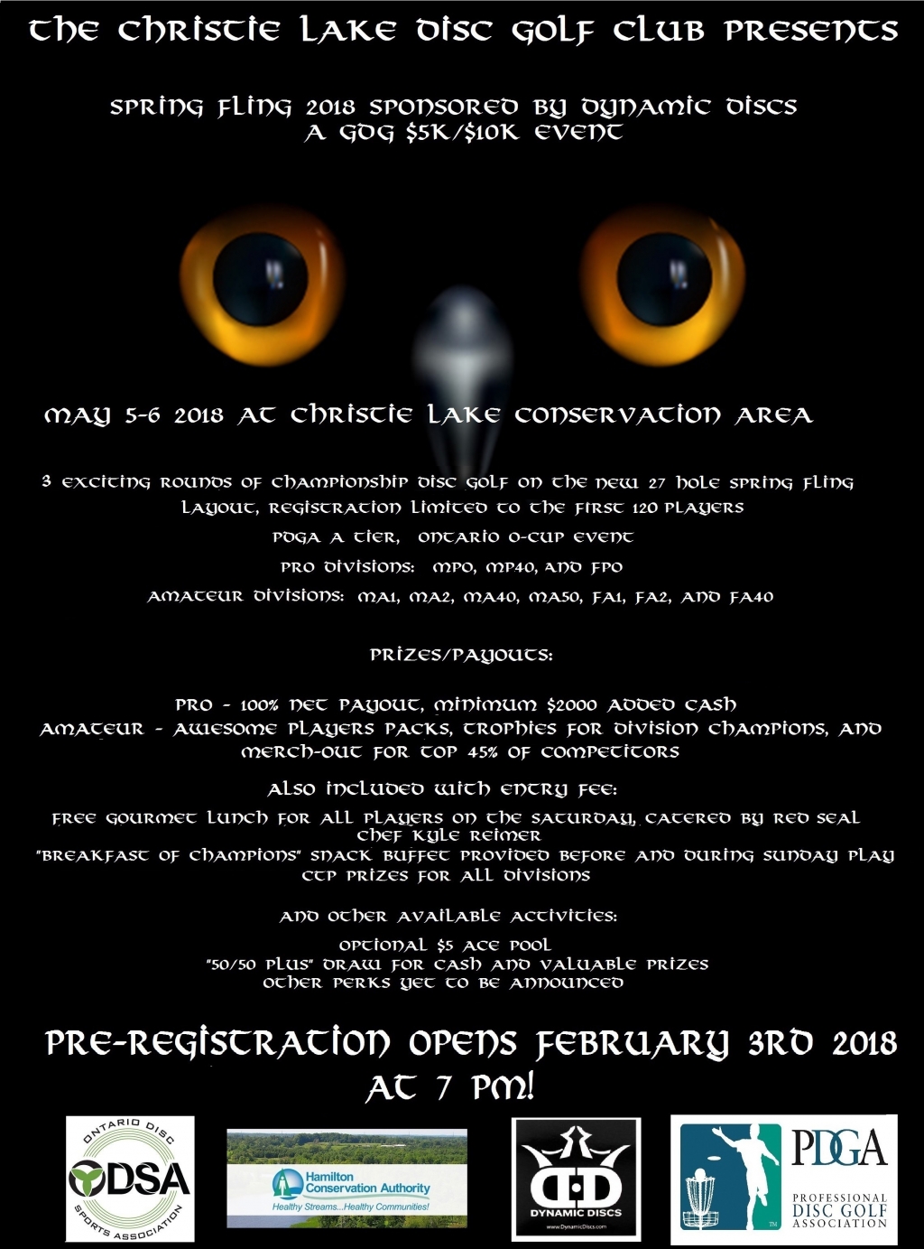 Christie Lake Disc Golf Club Presents The 2018 Spring Fling, sponsored by Dynamic Discs! A GDG $5K/$10K event! PDGA “A” Tier Tournament, ODSA Ontario Cup event.