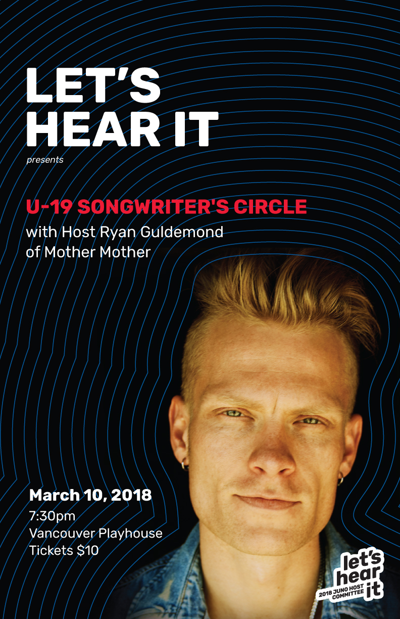 Vancouver, BC – Often heralded as the ‘Jewel of JUNO Week’, JUNO Songwriters’ Circle showcases some of Canada’s most talented songwriters, performing their original songs and sharing the stories behind them. In a similar fashion, on March 10 at 7:30pm at the Vancouver Playhouse, the 2018 JUNO Awards Host Committee is hosting a variation on the traditional ‘Songwriters’ Circle’ experience, focusing on an under-19 target audience. Hosted by JUNO Award winning performer, songwriter and producer Ryan Guldemond of Mother Mother, the evening includes a great roster of Canadian talent who vary in career stage, style and genre, including: • Classical Composer – Jordan Nobles • EDM Producer and Vocalist – Nick Middleton (Funk Hunters) w/ Georgia Murray • Singer Songwriter – FIONN • Emerging Songwriter – Justin Pham • Singer Songwriter – Ta’Kaiya Blaney w/ Aaron Ross (Boom Booms) • Producer/Songwriter – Chin Injeti w/ Ty Waters