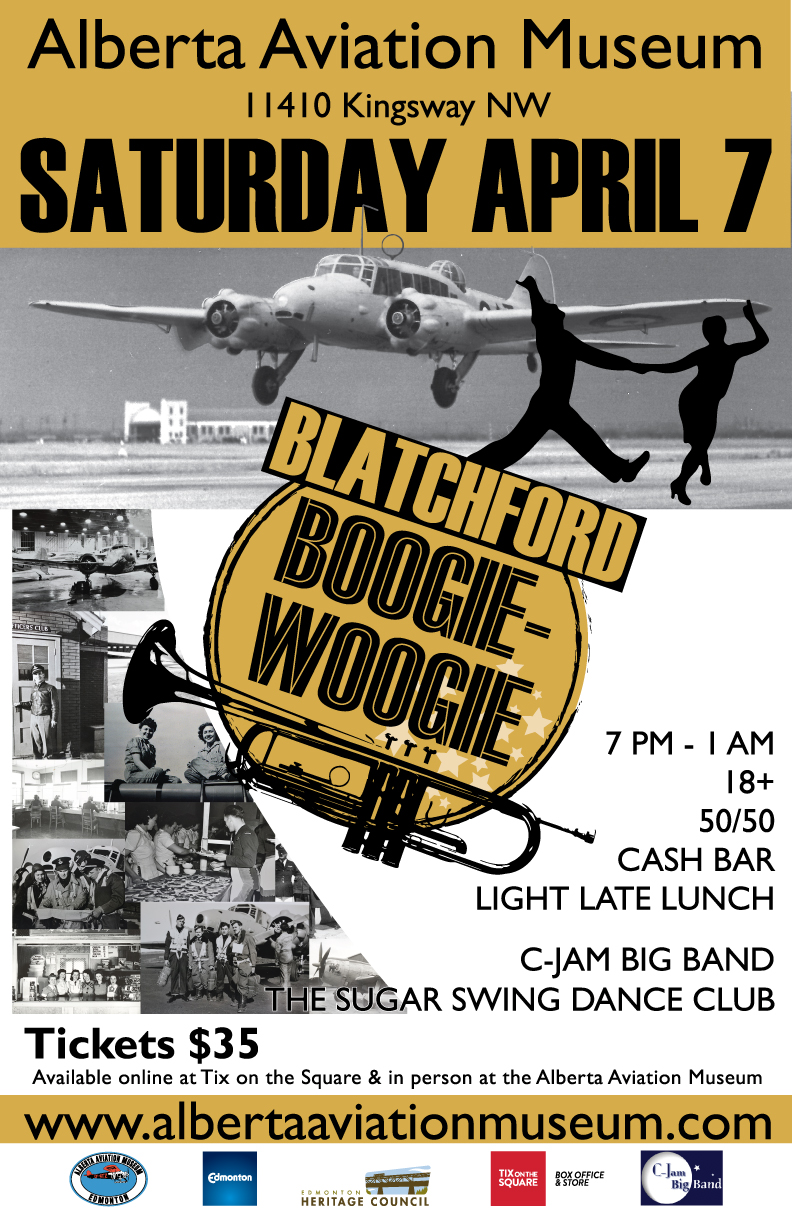 Don’t be a flat tire! Let the C-Jam Big Band and Sugar Swing Dance Club swing you into spring at the Alberta Aviation Museum’s Blatchford Boogie-Woogie on Saturday April 7th from 7 PM – 1 AM! Tickets are $35. Available online through TIX on the Square and in person at the museum. Take a step back in time, grab your favourite pair of saddle shoes, and dance the night away at an event inspired by Edmonton’s own WWII era Hangar 14. The museum will be open from 7pm – 9pm with exclusive access for ticket holders, then music and dancing will top off the evening. This is an 18+ event and includes cash bar, 50/50, and a light late lunch. There is no ATM on site. This organization is supported by The Edmonton Heritage Council and the City of Edmonton.