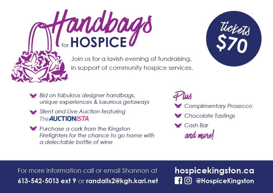 Handbags for Hospice is the ultimate ladies’ night out. It’s an engaging and lavish evening for people to come together, socialize and to learn more about the services Hospice Kingston provides to our community. In addition to the incredible silent auction, we will have a live auction featuring Layne, The Auctionista! Guests will also enjoy the chance to win a live auction item with the coveted ‘golden ticket’, a wine-pull, complimentary Prosecco, hors-d’oeuvres, chocolate tastings, cash bar and more!!