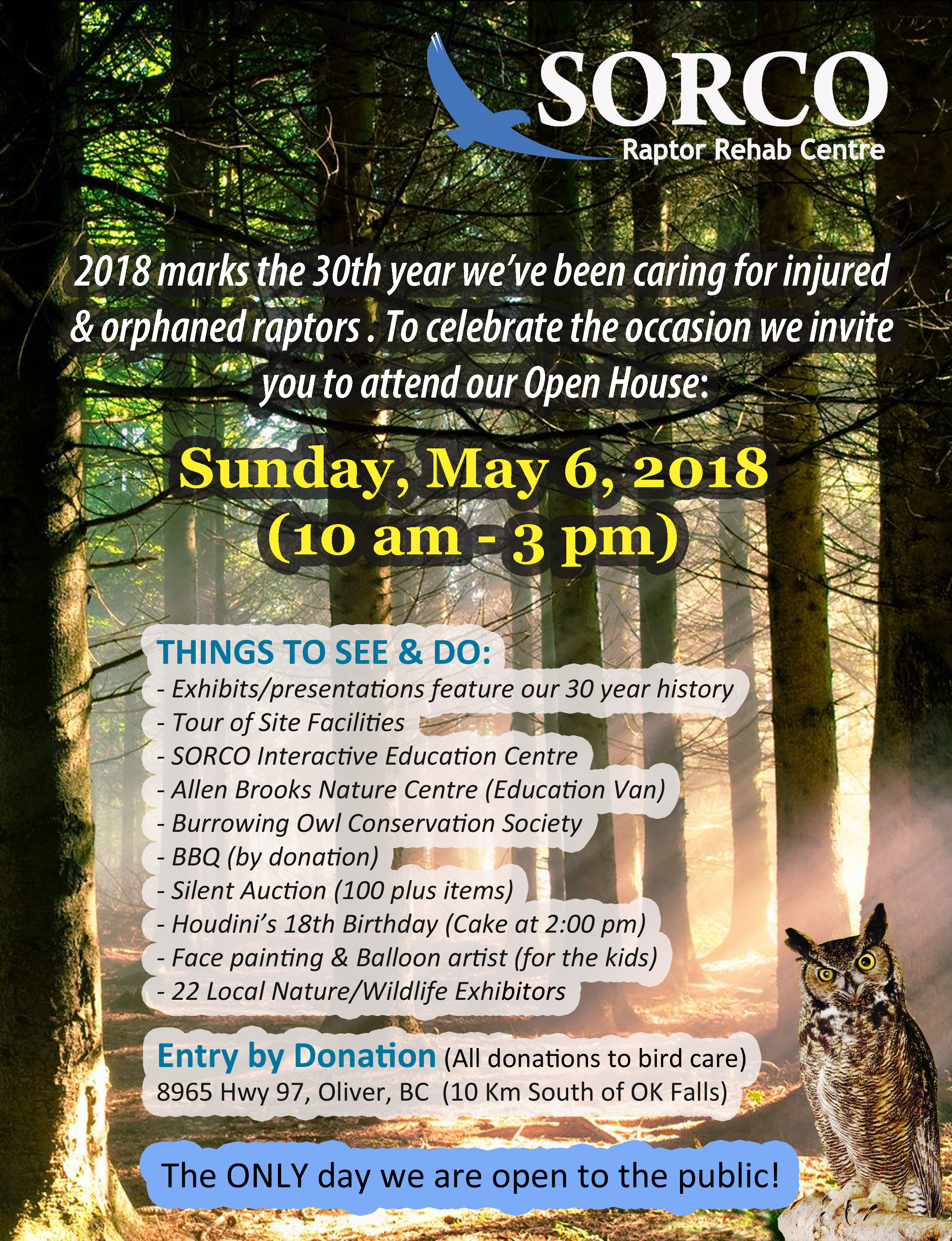 Annual Open House-30th Anniversary. This is the only day we are open to the public to view our facilities, rehabbing raptors and the work we do. Meet our educational great horned owl “HOUDINI”