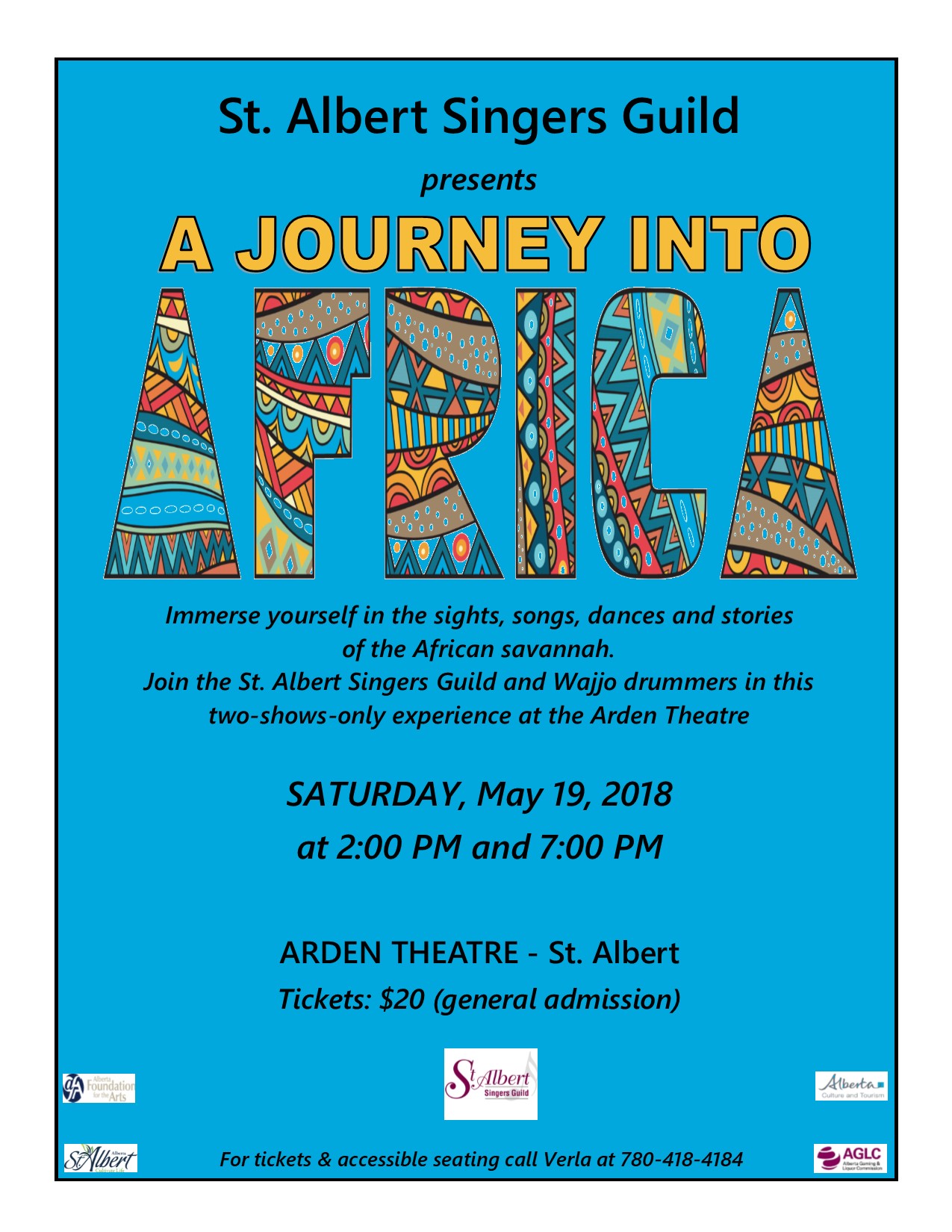 The St. Albert Singers Guild invites you to experience Africa in a new and unique way as they sing, dance, tell folk tales and welcome drummers from Wajjo onto the Arden Theatre stage. The sights, songs and stories of Africa are offered to the audience through the eyes of a young child as she walks the savannah in the footsteps of her father. The two choirs of the St. Albert Singers Guild numbering 75 singers, take the stage on May 19 for two shows only at 2:00 and 7:00 PM. This energizing and immersive experience is a not-to-be-missed opportunity for the whole family. Tickets are $20. Call Verla 780-418-4184 for tickets and more info. sasgmanager@gmail.com
