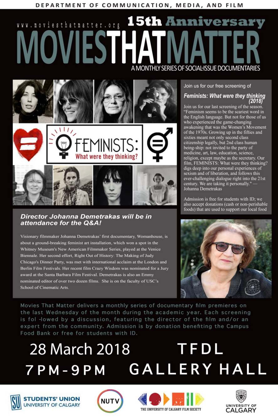 We are excited to present the final screening for the Winter 2018 Season with director Johanna Demetrakas IN ATTENDANCE! :) Here’s the synopsis of the film: In 1977, a book of photographs captured an awakening — women shedding the cultural restrictions of their childhoods and embracing their full humanity. Feminists — What Were They Thinking? revisits those photos, those women and those times — and takes aim at our current culture revealing all too vividly the urgent need for continued change. THE WOMEN IN THIS FILM TOOK POWER OVER THEIR OWN TRANSFORMATION AND HELPED INSPIRE A GLOBAL SHIFT IN WOMEN’S IDENTITY “Feminism seems to be the scariest word in the English language. But not for those of us who experienced the game-changing awakening that was the Women’s Movement of the 1970s. Growing up in the fifties and sixties meant not only second class citizenship legally, but 2nd class human being-ship: not invited to the party of medicine, art, law, education, science, religion, except maybe as the secretary. Our film, FEMINISTS: What were they thinking? digs deep into our personal experiences of sexism and of liberation, and follows this ever-challenging dialogue right into the 21st century. We are taking it personally.” — Johanna Demetrakas, Director Featuring interviews with Gloria Steinem, Lily Tomlin, Michelle Phillips, Cynthia MacAdams, Cheryl Swannack, Jane Fonda, Kate Millet, Meredith Monk, Laurie Anderson, among others! A film by Johanna Demetrakas. 30 minutes of Q&A with the director to follow the screening. All seating is first come, first served. Please arrive early. Free for students with ID and community by donation ($5.00 – $10.00 suggested) All proceeds go towards the Campus Food Bank.