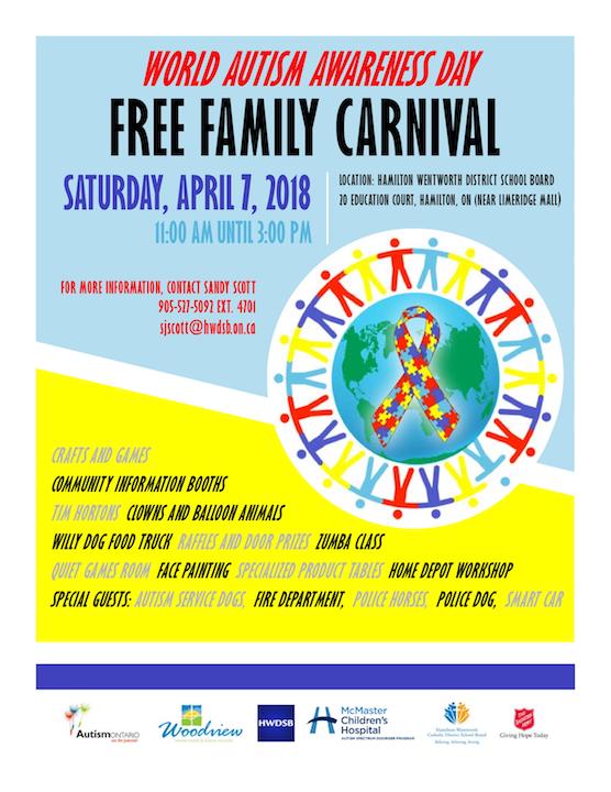 Come celebrate World Autism Awareness Day with a fun, Family Carnival! On Saturday April 7th from 11:00 until 3:00 Hamilton’s Autism Awareness Committee is hosting an exciting event for families to enjoy time together while supporting the Autism community. Admission is free! The carnival will have fun activities such as: *Creating with Home Depot *Face Painting *Crafts *Balloons with Phoebe the Clown *Zumba *Willy Dog Hot Dogs *Tim Horton’s Coffee Truck *Specialty Vendors and so much more!