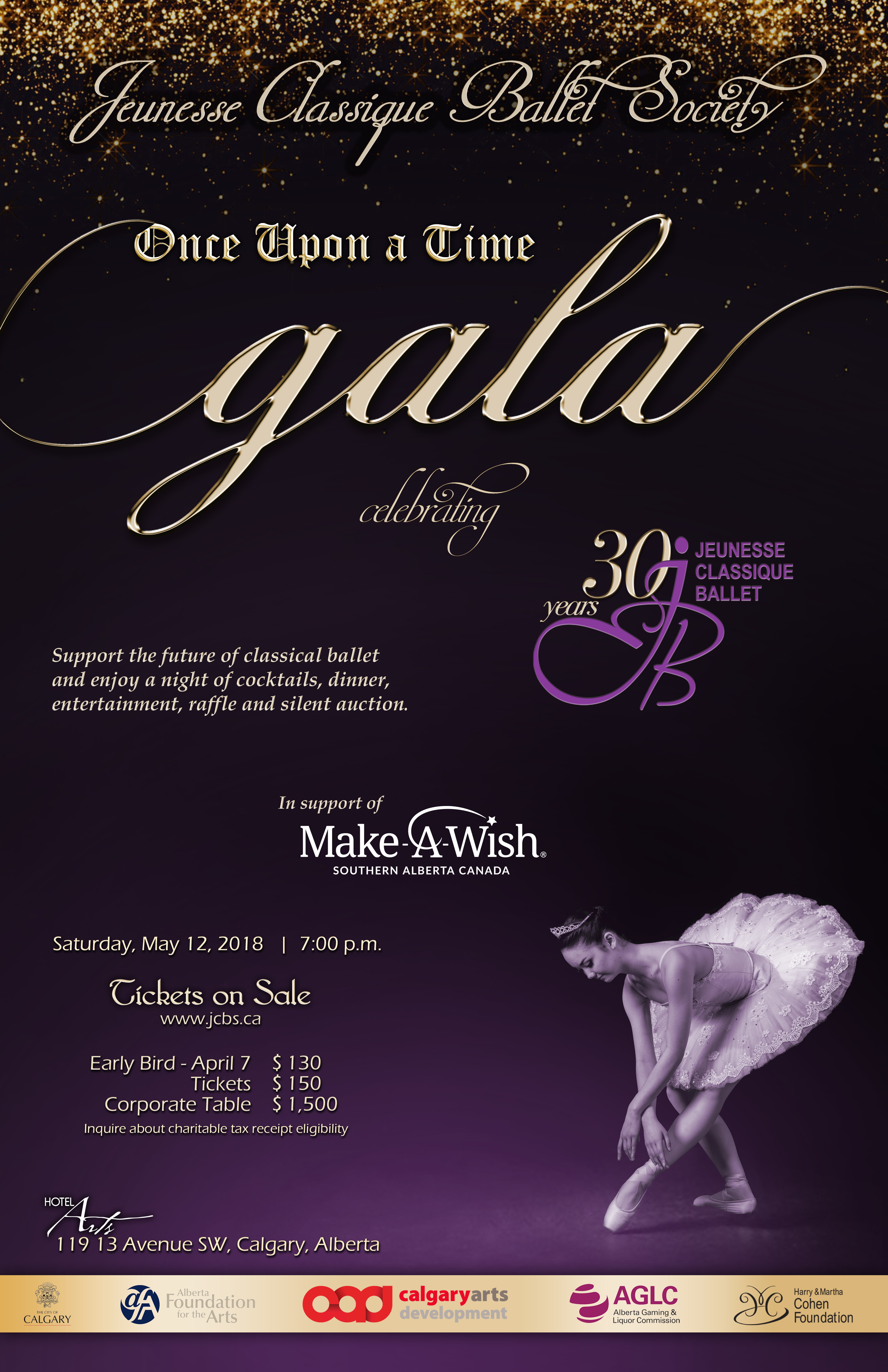 Celebrate 30 YEARS with Jeunesse Classique Ballet at the; Once Upon A Time Gala Fundraiser and Support The Art Of Classical Ballet & Make A Wish Foundation! HOTEL ARTS CALGARY May 12, 2018 COCKTAILS I DINNER I RAFFLE I AUCTION I ENTERTAINMENT TICKETS EARLY BIRD (APR.12) $130 I TICKETS $150 I TABLES $1500 Sponsorship Opportunities & Tables are open! Please contact Justine Hall justine.hall240@gmail.com for more information. Visit Our Website! http://www.jcbs.ca #jeunessegala2018 #hotelarts