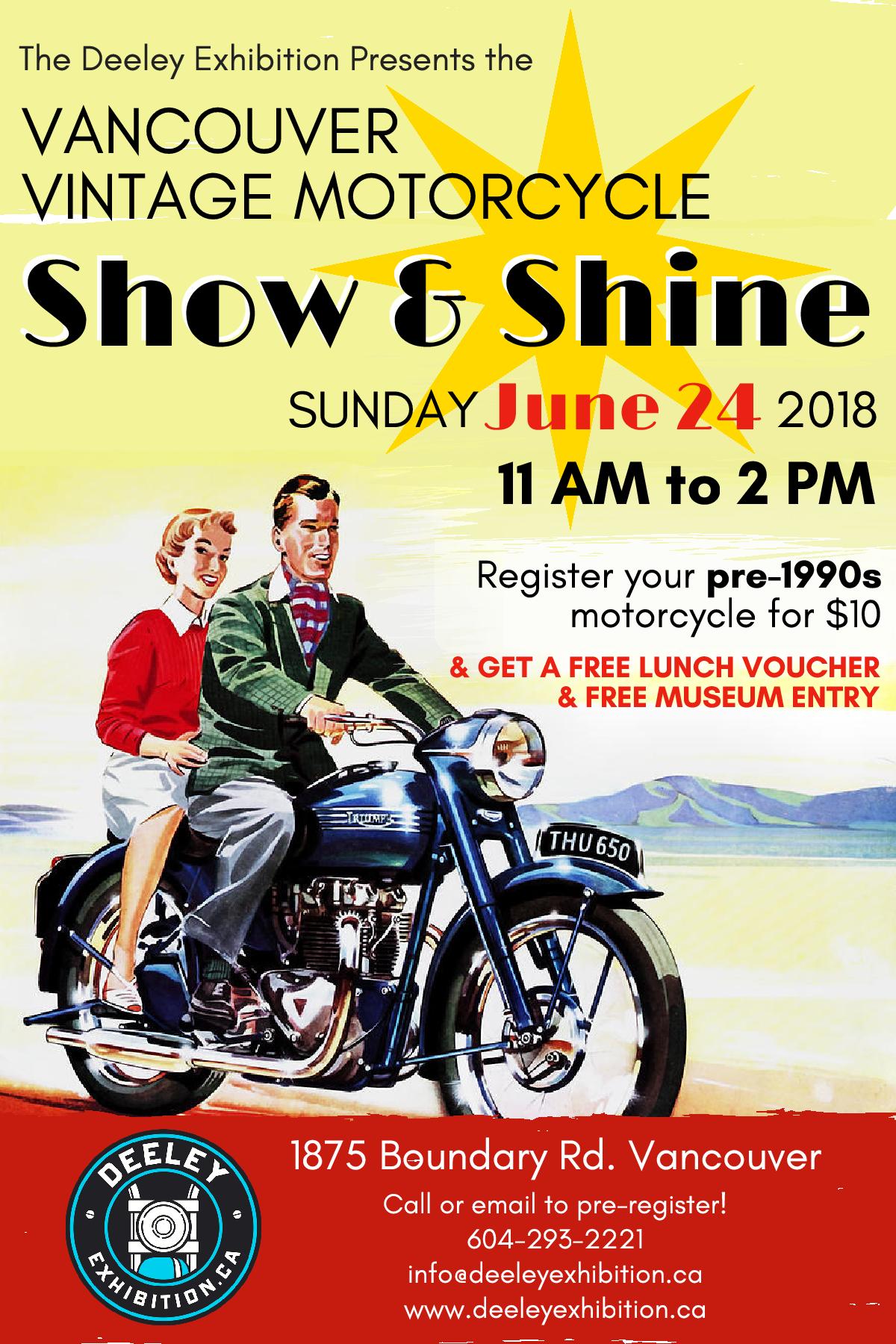 Do you have a Vintage motorcycle you’d like to show off? Love antique motorcycles? Whether you ride or not, come down June 24th for the 5th annual Vancouver Vintage Motorcycle Show & Shine! Select rare motorcycles from the collection will be on display as well as several vendors for you to check out. Bikes, burgers, and a good time to be had by all! $10 bike registration gets you a free lunch as well as free museum entry! For more information or to pre-register, call us at 604 293 2221 or email info@DeeleyExhibition.ca.