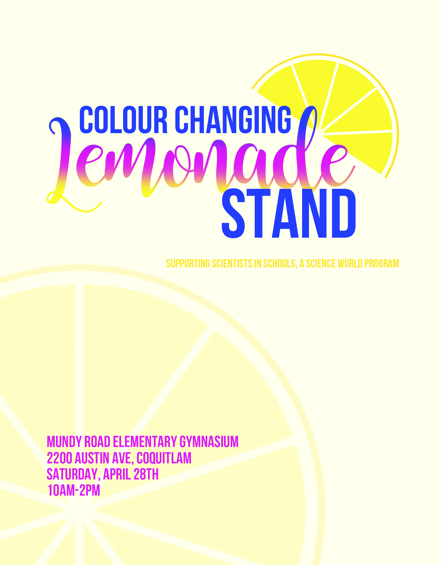At 5 1/2 years old, Evelyn is hosting a Lemonade Stand at her School’s Community Garage Sale that features colour-changing lemonade. The effect is achieved through Blue Pea Flower Tea which acts as a natural pH indicator. When added as ice to an acidic liquid like Lemonade the dark blue iced tea cubes turn the lemonade pink as they melt creating a cool ombre effect. Evelyn wants to be a Marine Biologist when she grows up she has chosen to donate the proceeds of her lemonade stand to Science World’s Scientists & Innovators in the Schools (SIS) Program that brings working scientists into classrooms to teach kids about STEAM careers. Her lemonade will be served in a lab coat and safety goggles and will come in both the pink and yellow variety. The stand will feature a demonstration of how Blue Pea Flower Tea reacts in different acidity levels as well as a photo wall to snap a selfie with your ombre concoction. Questions and support inquiries can be made at: colourchanginglemonade@gmail.com
